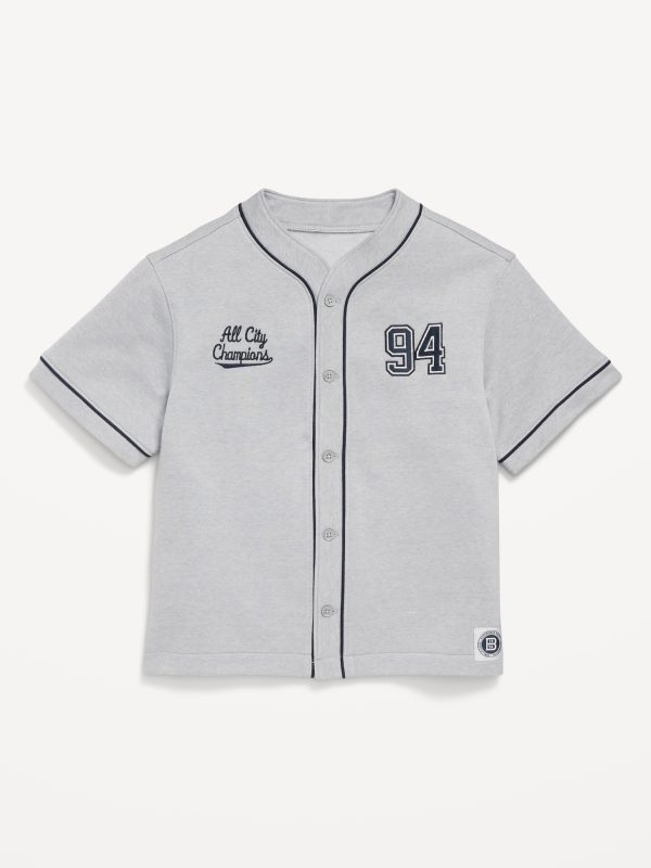 Oversized Fleece Baseball Shirt for Boys: v neck, short wide sleeves, drop shoulders, full length button front, small-scale embroidered graphic at chest, contrasting pipe trim along cuffs and center, small-scale embroidered patch at hem, #750064