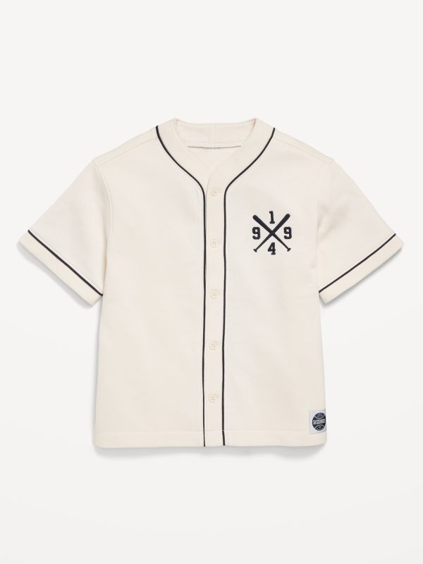 Oversized Fleece Baseball Shirt for Boys: v neck, short wide sleeves, drop shoulders, full length button front, small-scale embroidered graphic at chest, contrasting pipe trim along cuffs and center, small-scale embroidered patch at hem, #750064