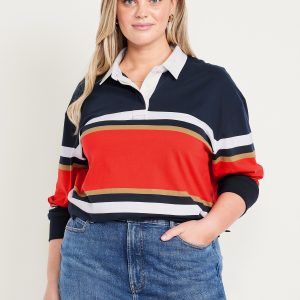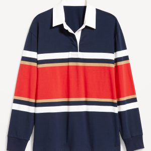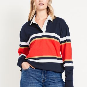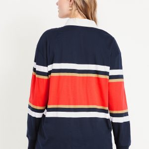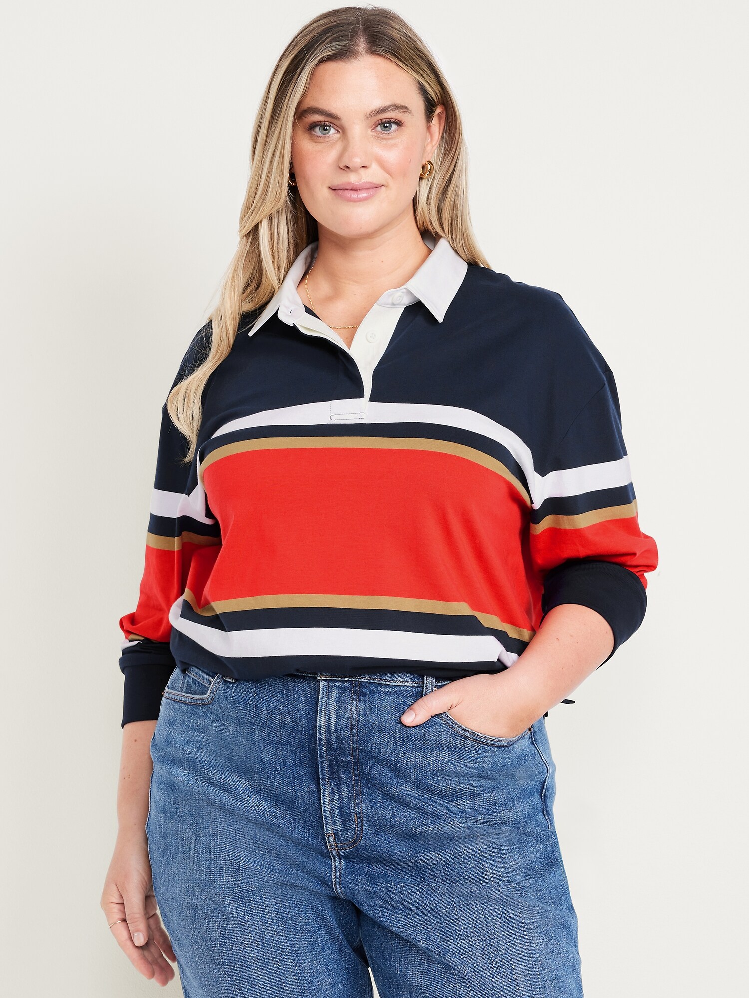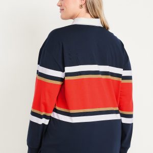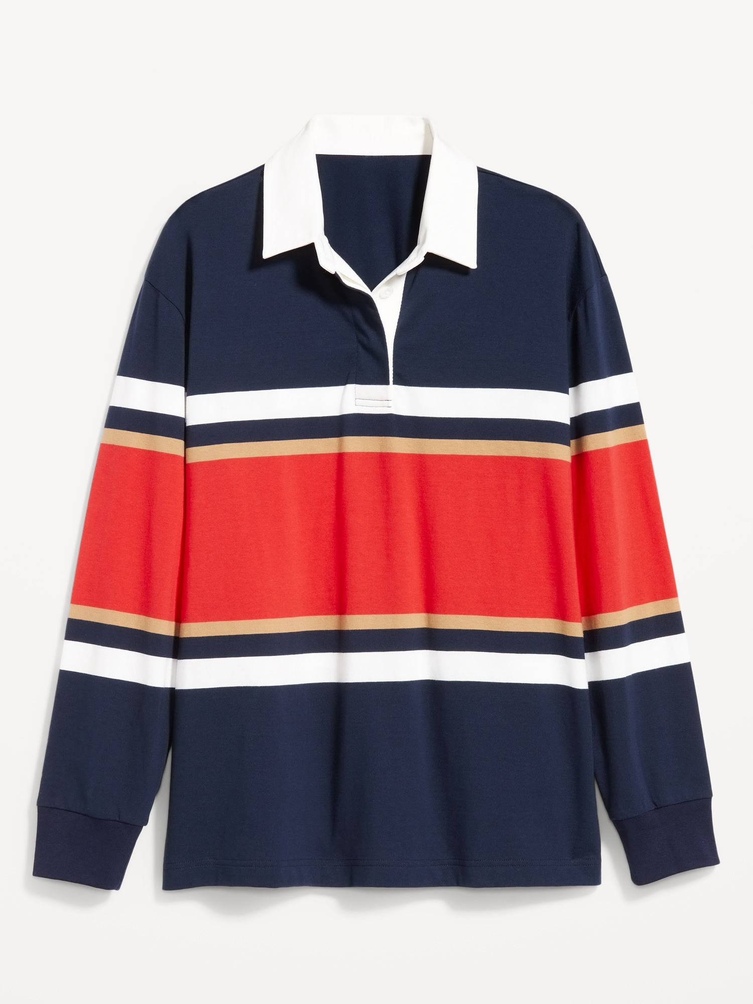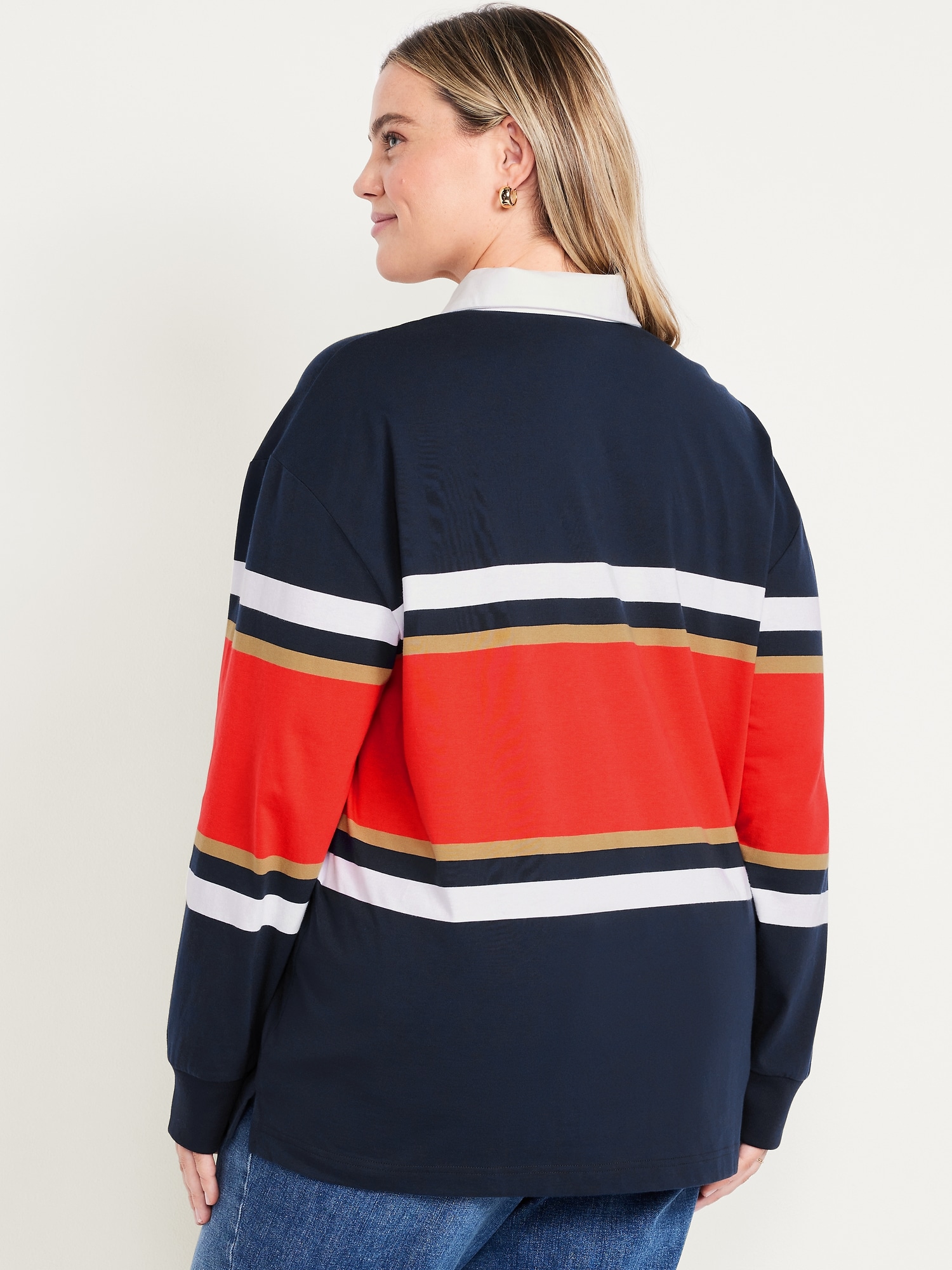 Oversized Rugby-Stripe Top: spread buttoned collar, long drop-shoulder sleeves, contrasting rugby stripes, vented sides, #844568