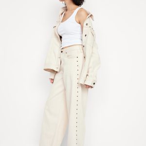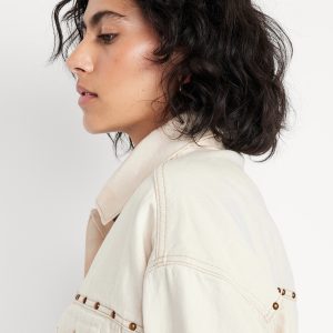Oversized Studded Jean Jacket: studded accents, spread collar, long sleeves with buttoned cuffs, full-button front, button-flap chest pockets, vertical welt pockets, #790495