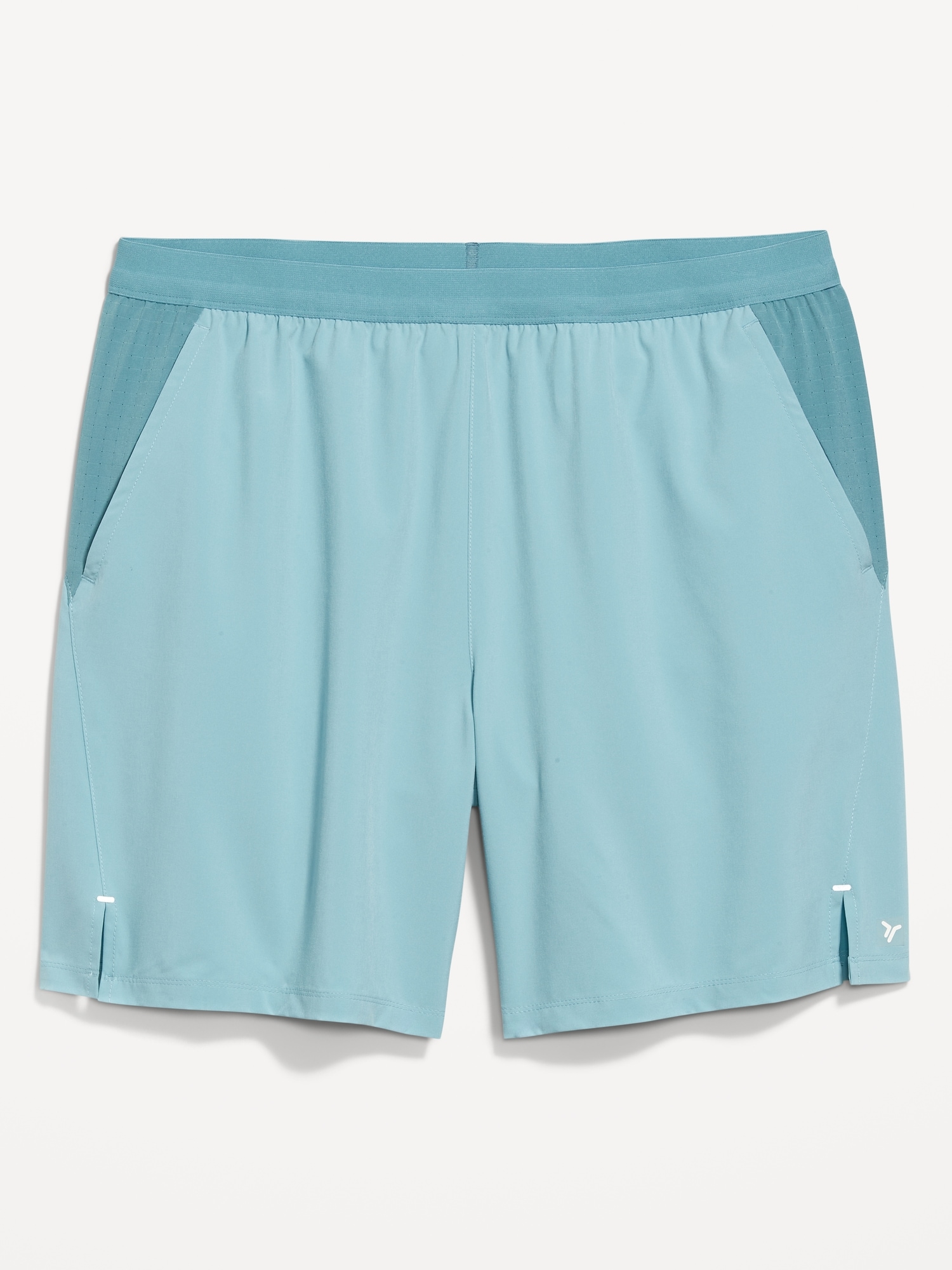 Performance Vent Run Shorts — 7-inch inseam: elastic-drawstring waistband, hidden back pocket at waist, diagonal hip pockets, vented sides, built-in briefs, breathable, quick dry, four-way stretch, #693436