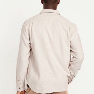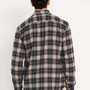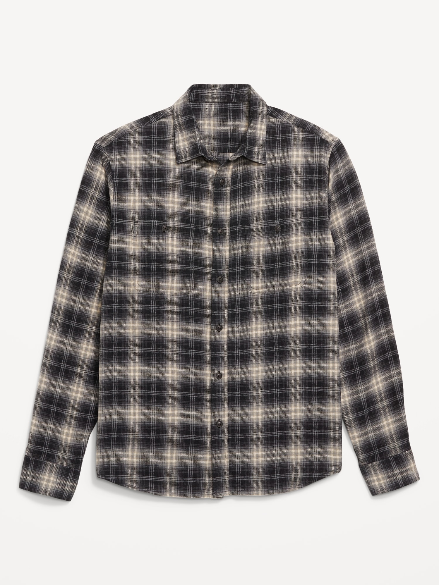 Plaid Flannel Pocket Shirt: spread collar, long sleeves with buttoned cuffs, button-patch chest pockets, full-button front, rounded hem, #801296