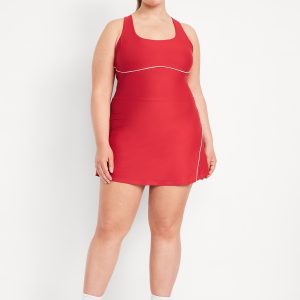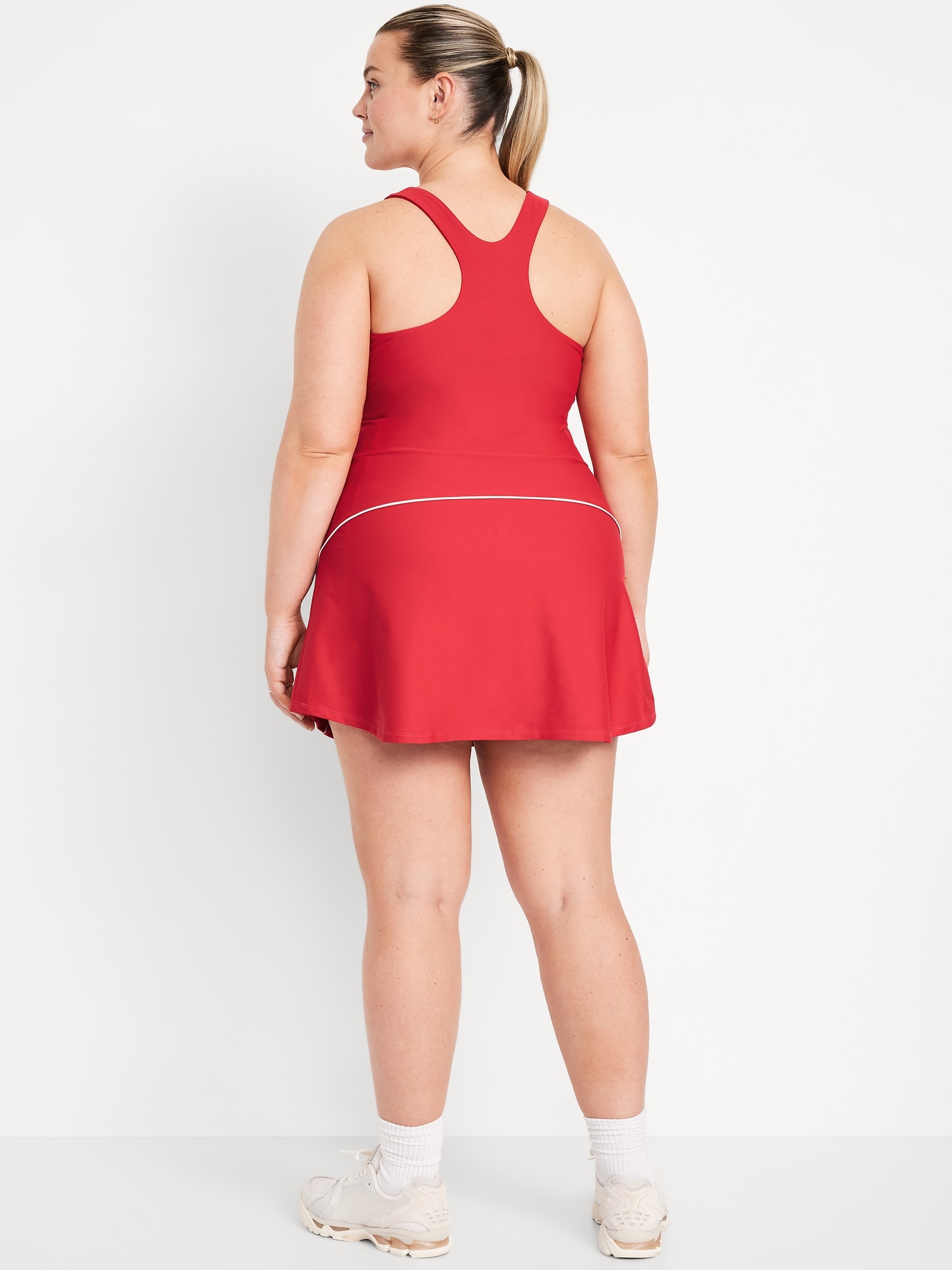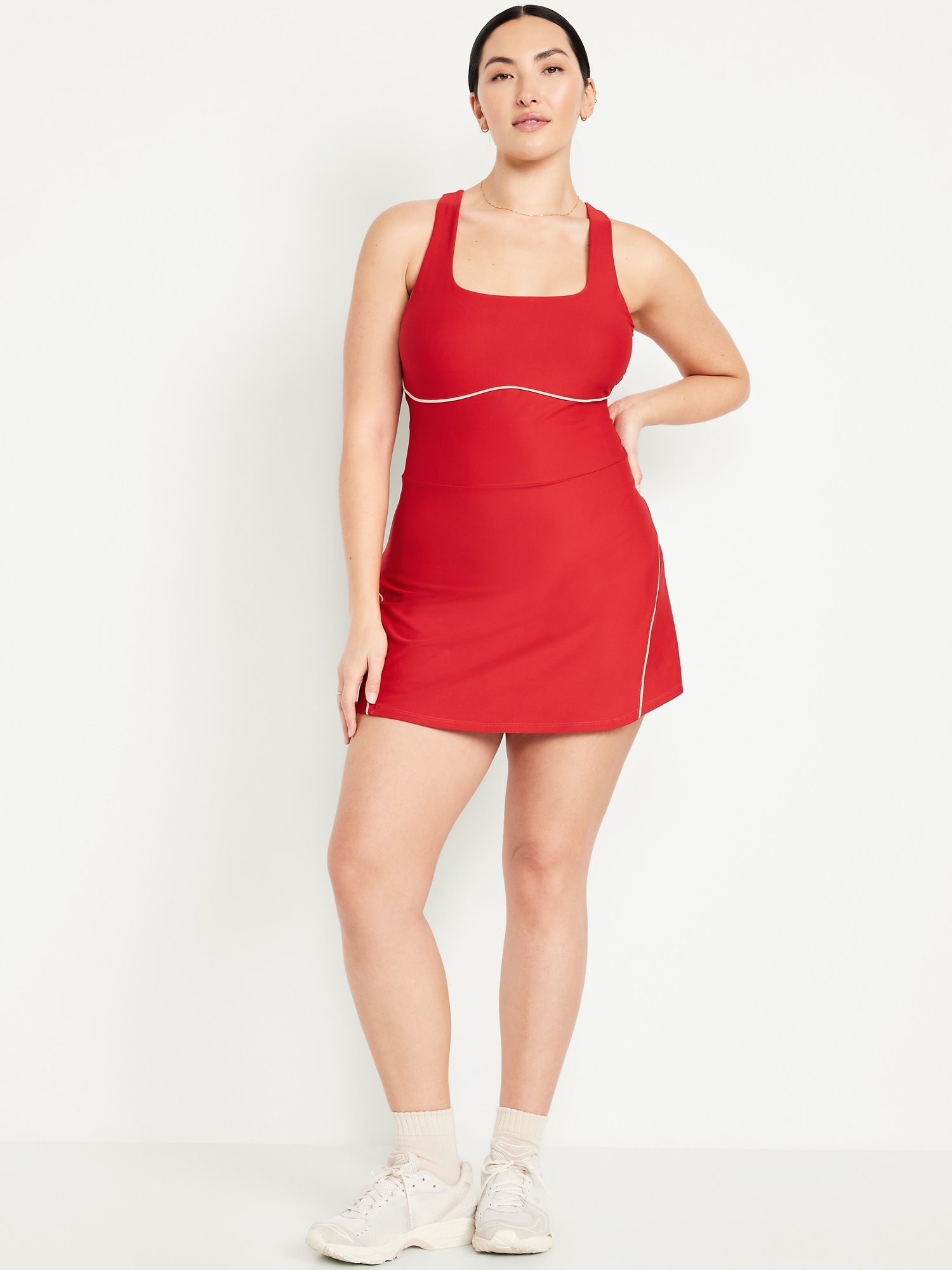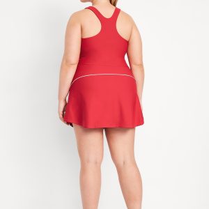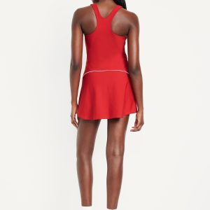PowerSoft Athletic Dress: Featuring PowerSoft. Light compression meets a peachy-smooth, sweat-wicking fabric.straight neck, wide straps, racerback, shelf bra with removable cups, contrasting piping, mini length, go-dry wicks moisture, #749126