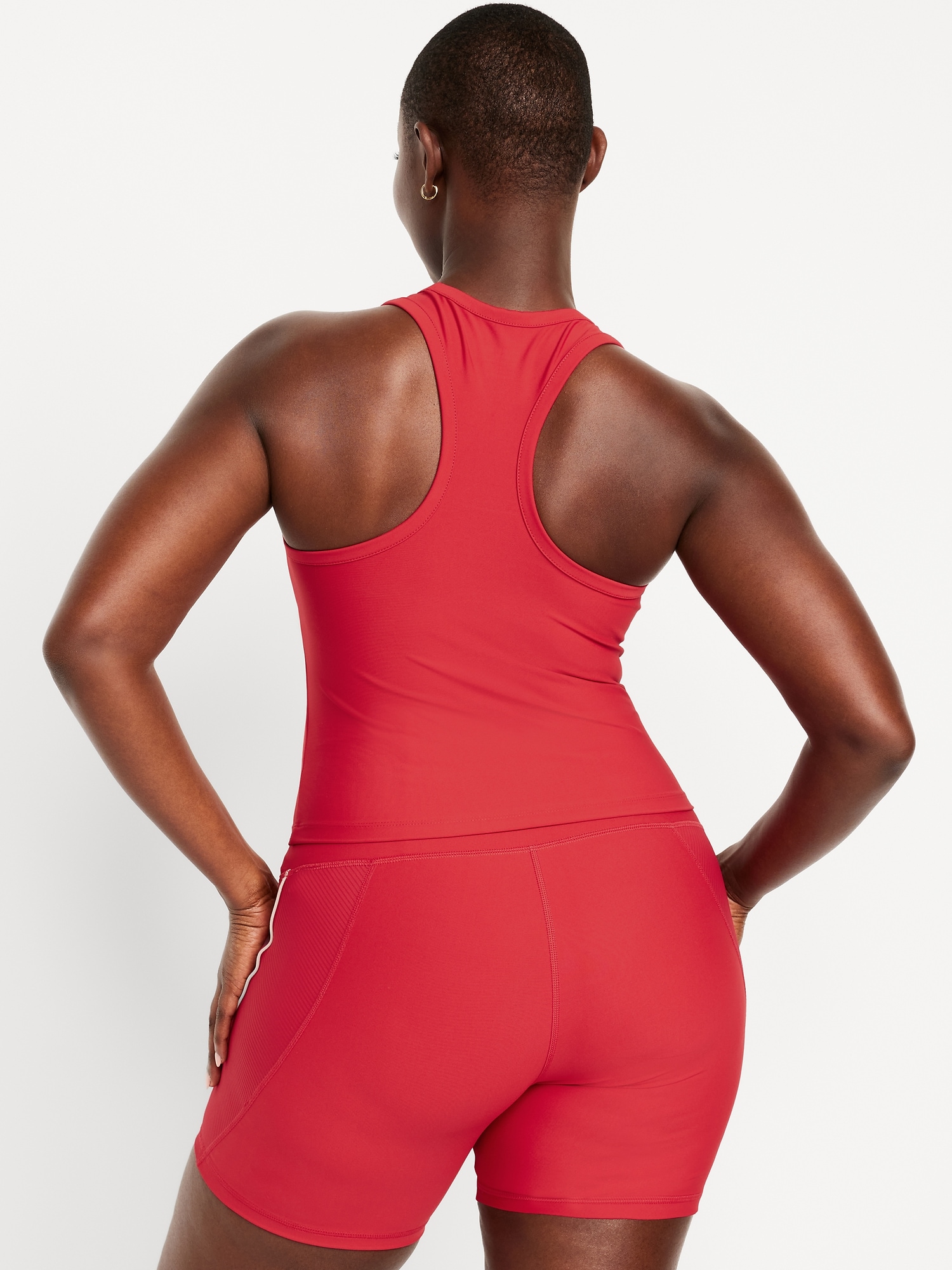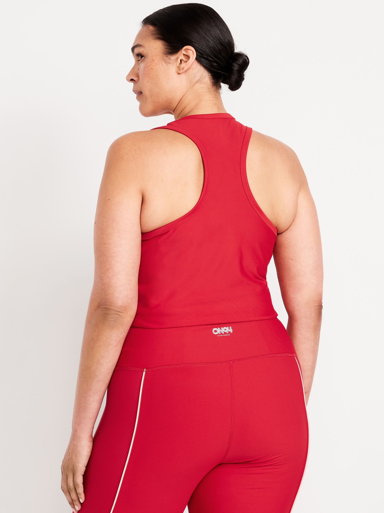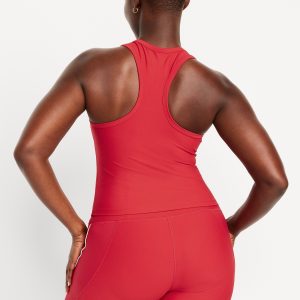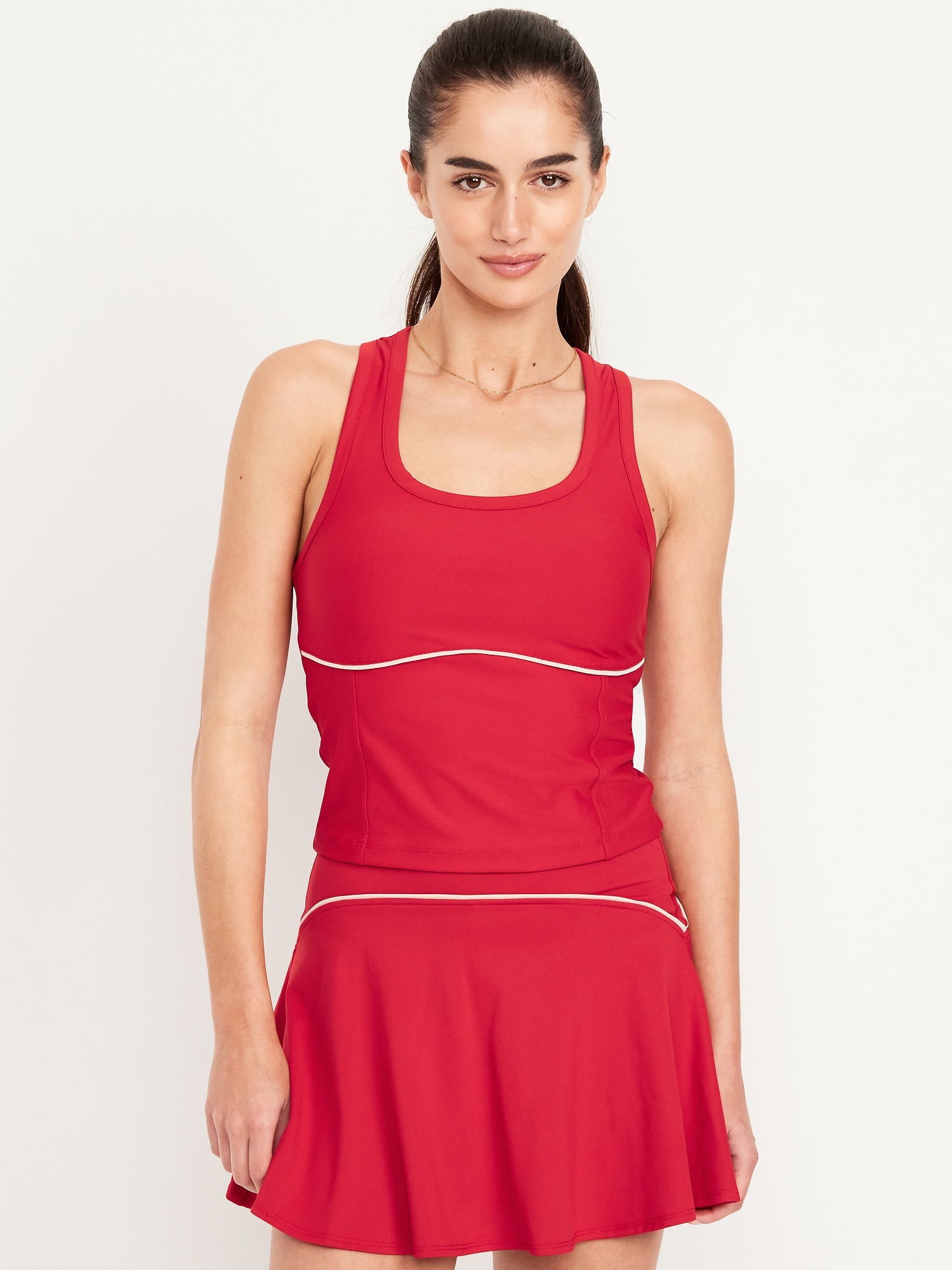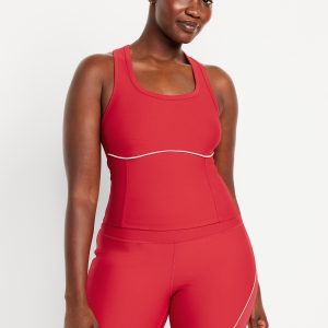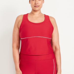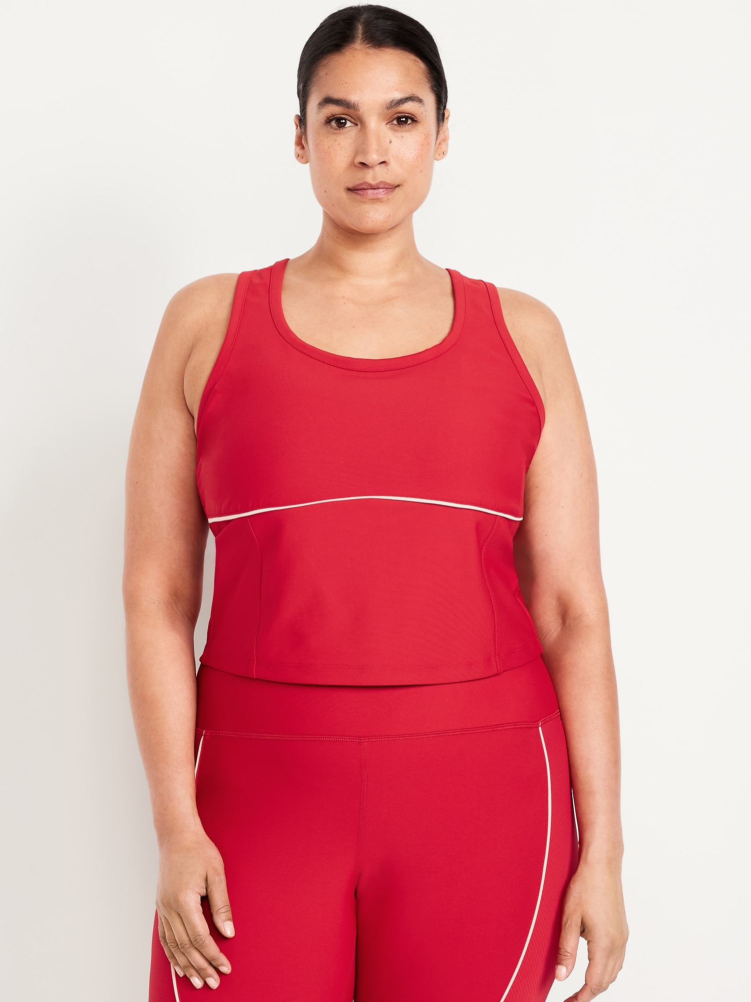 PowerSoft Racerback Cropped Shell Tank: Featuring PowerSoft. Light compression meets a peachy-smooth, sweat-wicking fabric.scoop neck, wide straps, racerback, contrasting piping, go-dry wicks moisture, #749263
