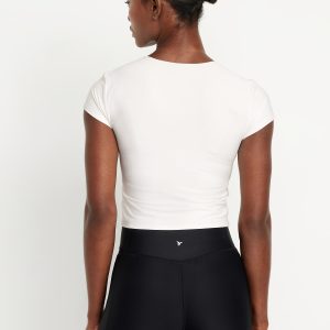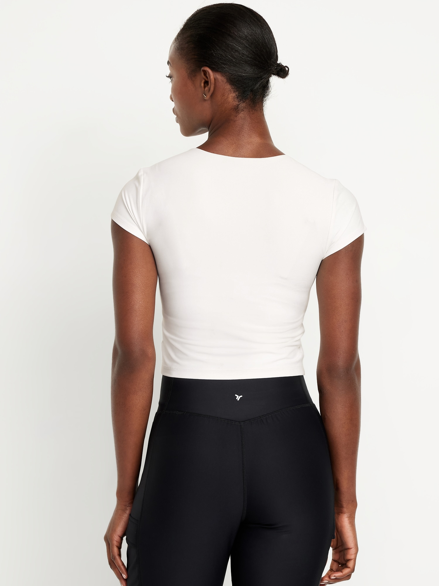 PowerSoft Support Crop Top: Featuring PowerSoft. Light compression meets a peachy-smooth, sweat-wicking fabric.crew neck, cap sleeves, removable pads, go-dry wicks moisture, #484464