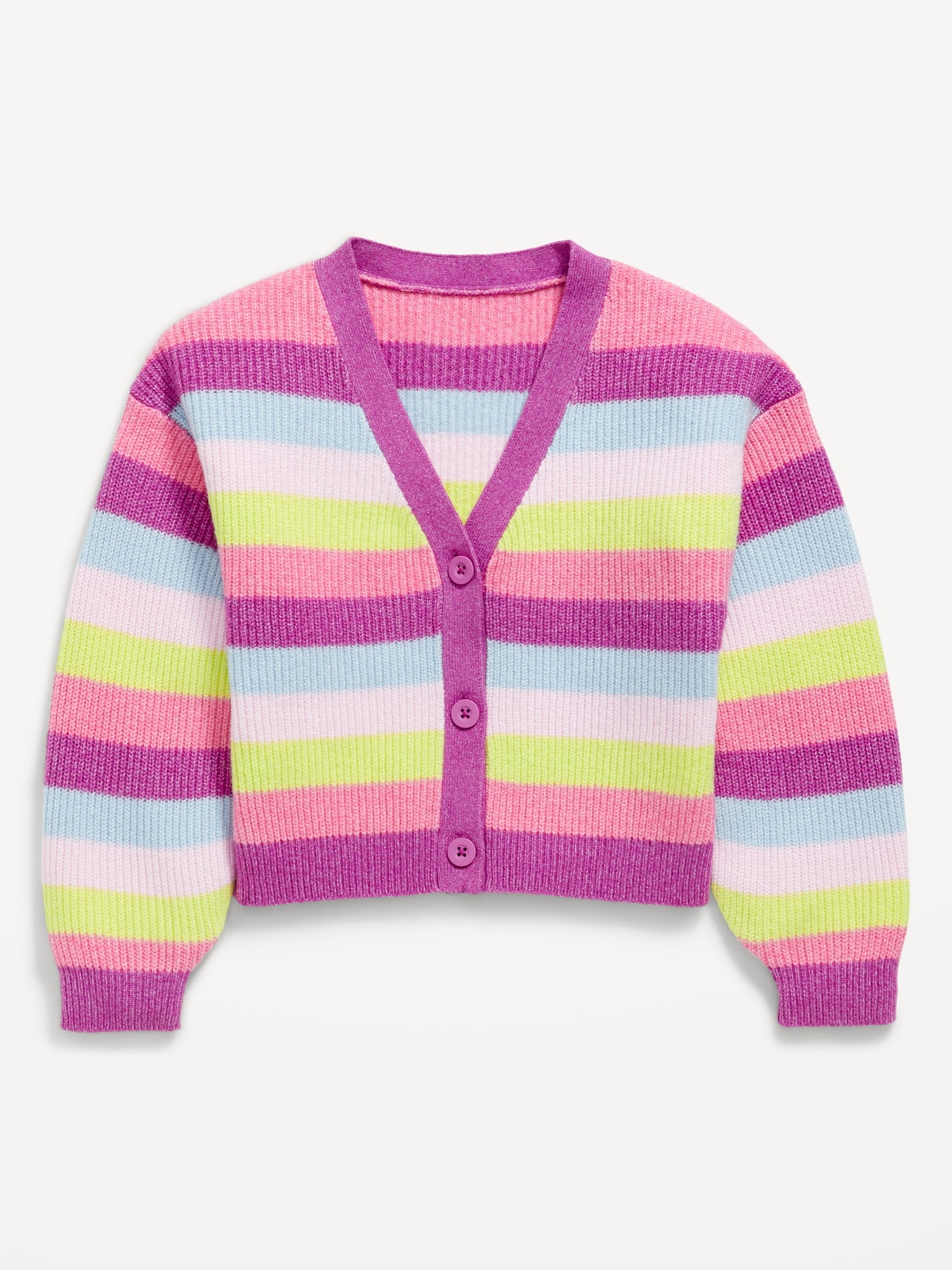 Printed Button-Front Cardigan Sweater for Girls: v neck, long sleeves, drop shoulders, buttoned placket, ribbed hem, all-over print, #766958