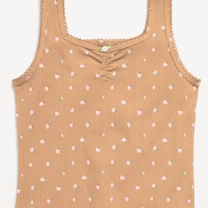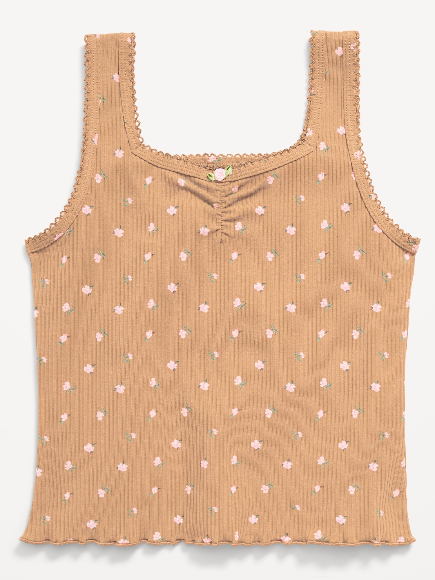 Printed Fitted Ribbed Tank Top for Girls: sweetheart neckline, sleeveless, ruching at chest, lettuce edge hem, all-over print, #708323