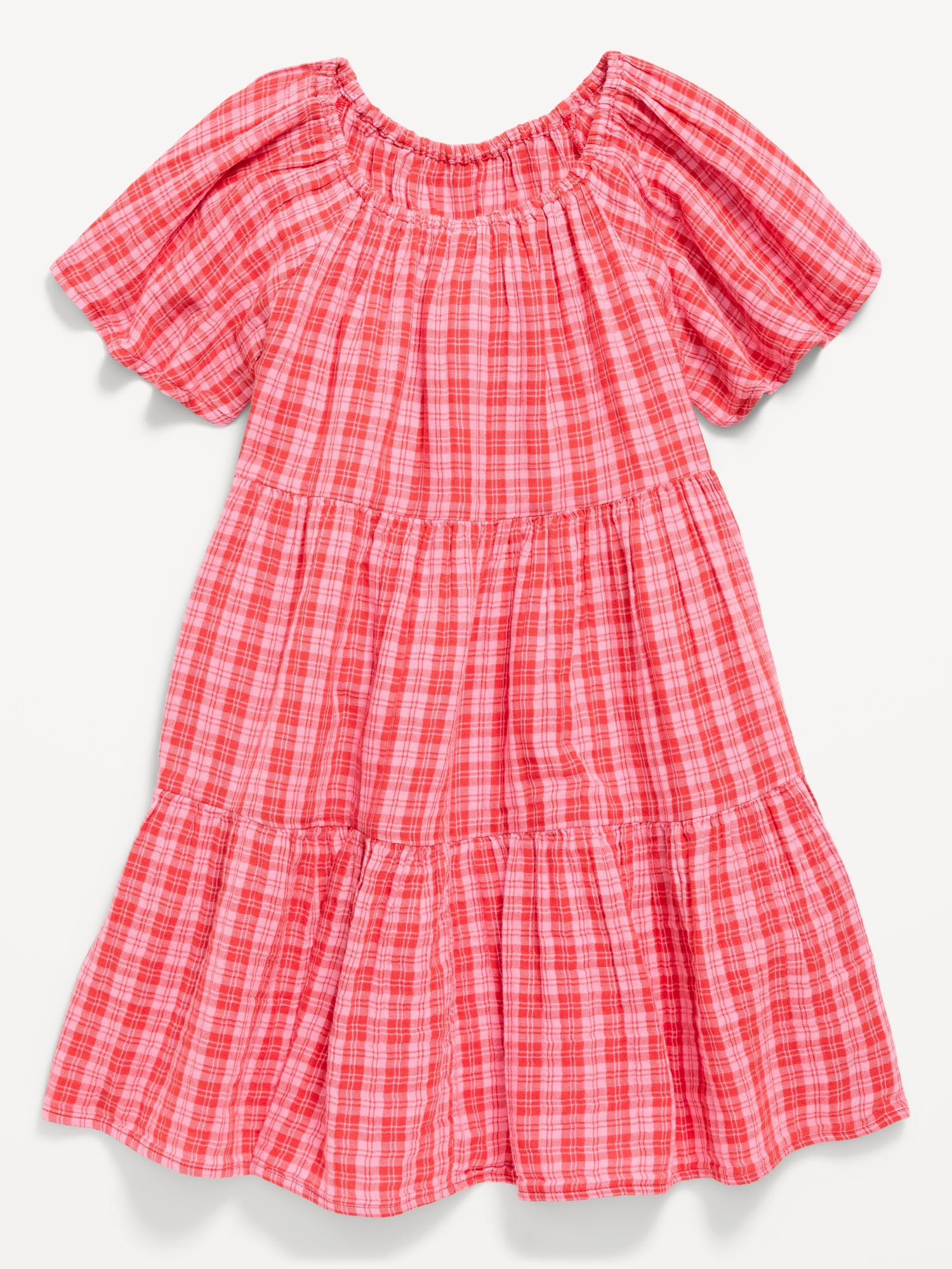Printed Flutter-Sleeve Double-Weave Tiered Swing Dress for Girls: square cinched neckline, short flutter sleeves, tiered skirt, all-over print, #806067