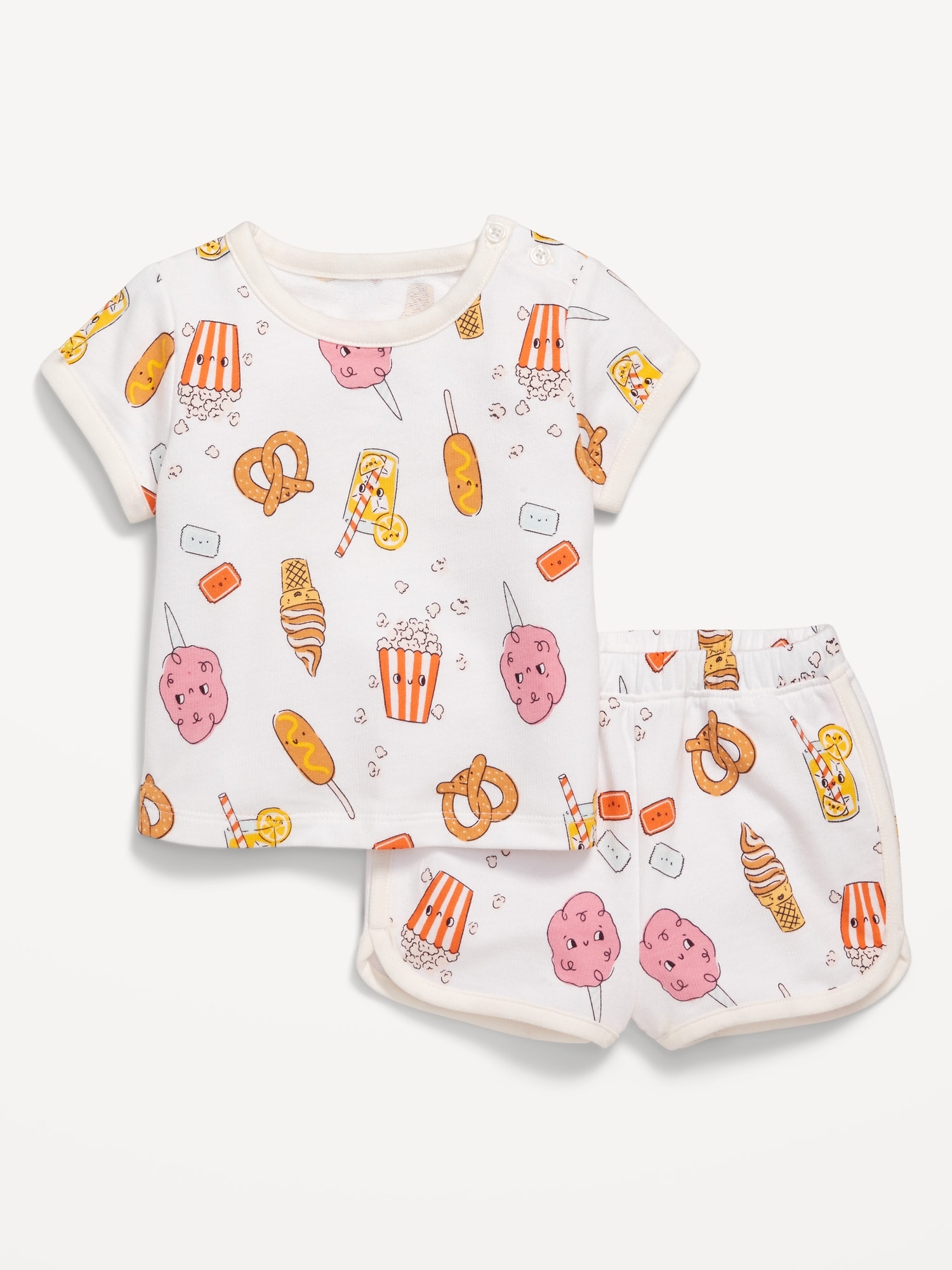 Printed French-Terry Ringer T-Shirt and Shorts Set for Baby: crew neck with buttons at shoulder, dolman sleeves, front graphic, functional elastic-drawstring waist shorts, available exclusively online and at old navy outlets, #766737