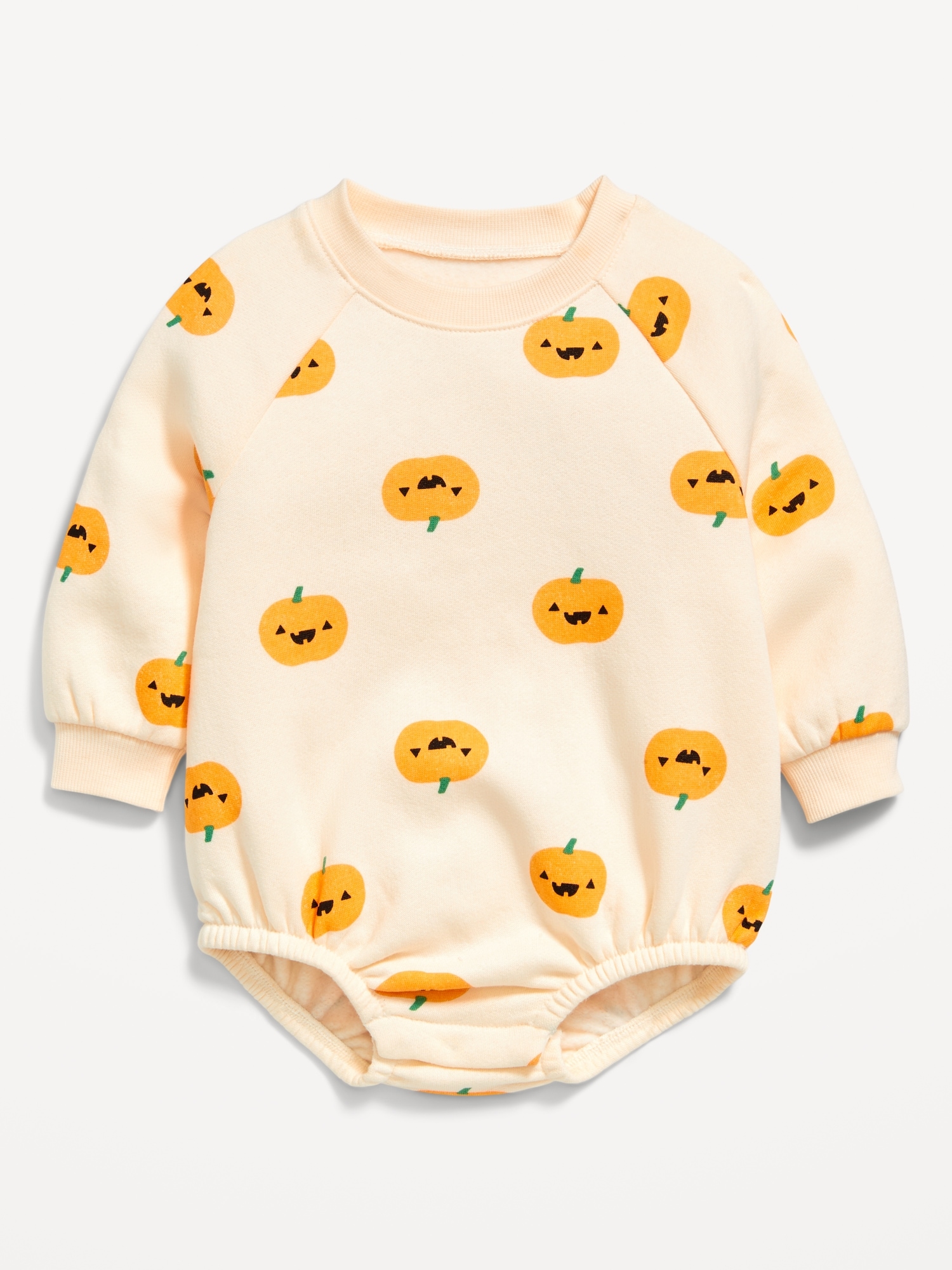 Printed Long-Sleeve Fleece Bodysuit for Baby: crew neck, long raglan sleeves, elasticized bubble leg openings, hidden snaps along inseam, all-over print, #802253