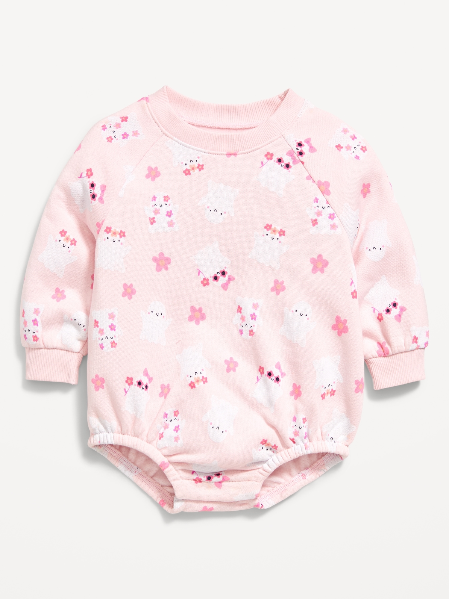 Printed Long-Sleeve Fleece Bodysuit for Baby: crew neck, long raglan sleeves, elasticized bubble leg openings, hidden snaps along inseam, all-over print, #802253