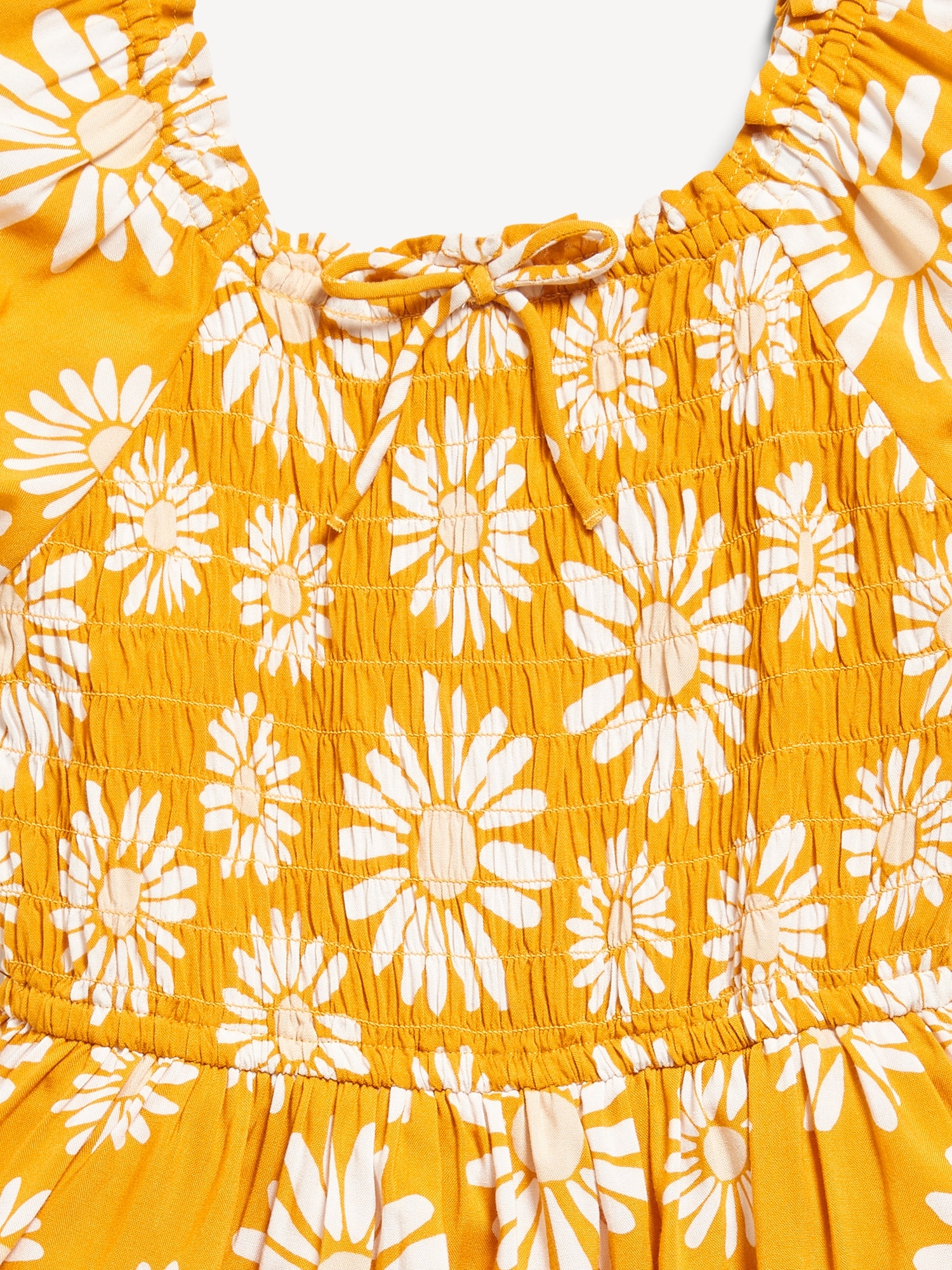 Printed Puff-Sleeve Smocked Dress for Girls: ruffled square neckline, short puff sleeves, smocked back, seamed waist, flowy skirt, built-in shorts, layered look at bottom, all-over print, #766638