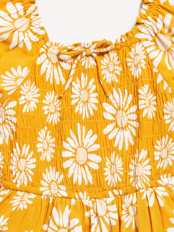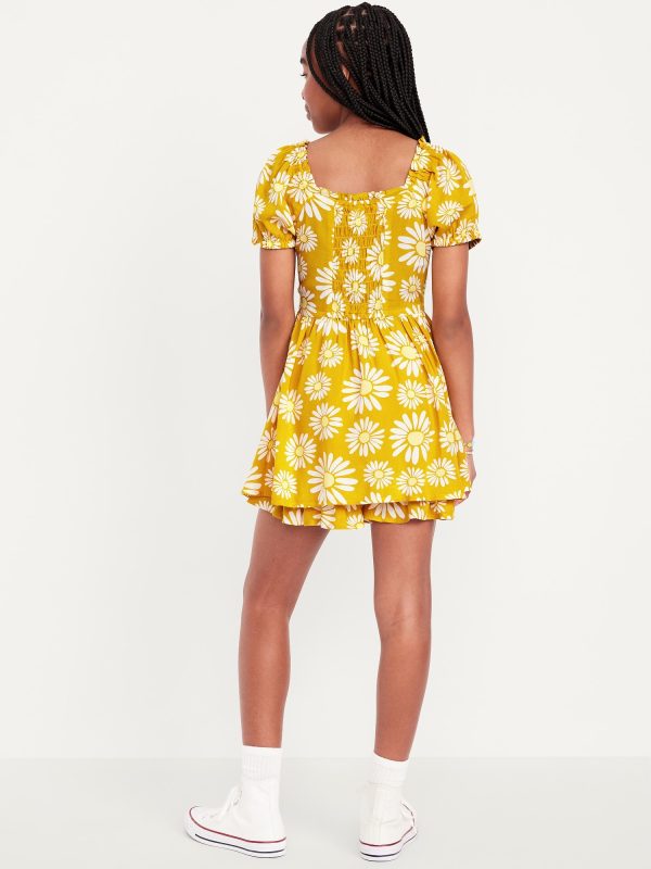 Printed Puff-Sleeve Smocked Dress for Girls: ruffled square neckline, short puff sleeves, smocked back, seamed waist, flowy skirt, built-in shorts, layered look at bottom, all-over print, #766638