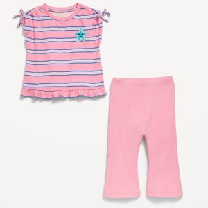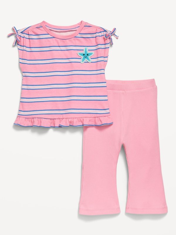 Printed Ruffle-Trim Top and Ribbed Flare Leggings Set for Baby: crew neck, sleeveless, tie-knots at shoulder, ruffled hem, all-over print or graphic at front, coordinating leggings, elasticized waistband, flare leg, #761827
