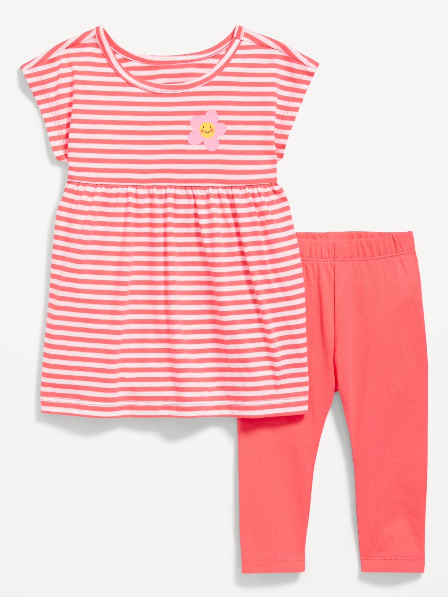 Printed Short-Sleeve Dress and Leggings Set for Baby: crew neck, short sleeves, seamed waist, flared skirt, coordinating leggings, elasticized waist, #694108