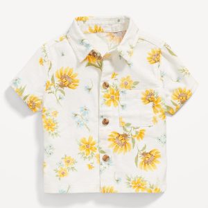Printed Short-Sleeve Linen-Blend Shirt for Baby: spread collar, short sleeves, full length buttoned placket, side slits at hem, embroidered trim along collar and cuffs (select colors), #762248