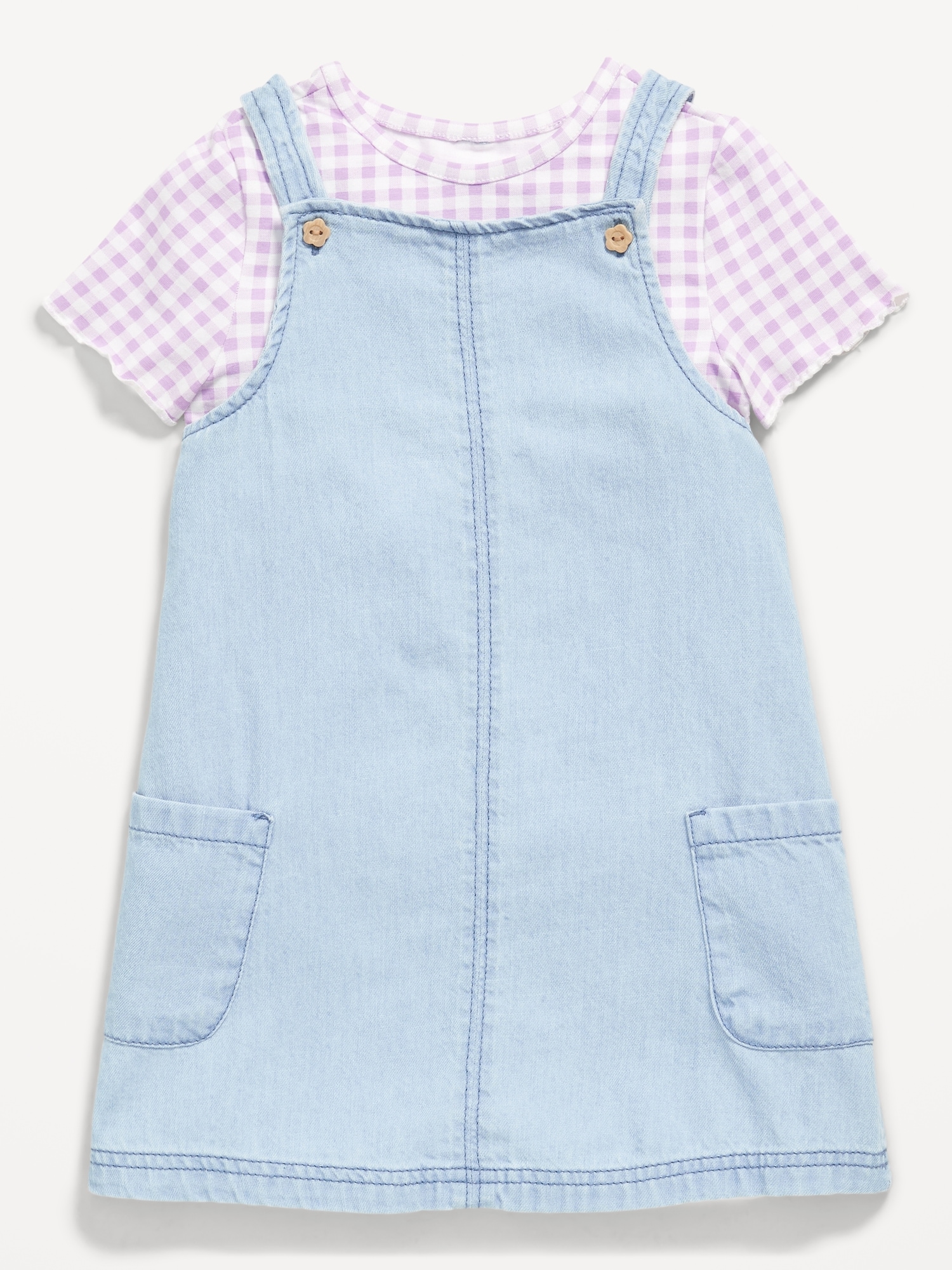 Printed Short-Sleeve T-Shirt and Jean Dress Set for Toddler Girls: crew neck, short sleeves, all-over print, coordinating dress, square neckline, scoop back, adjustable shoulder straps, side patch pockets, #766996