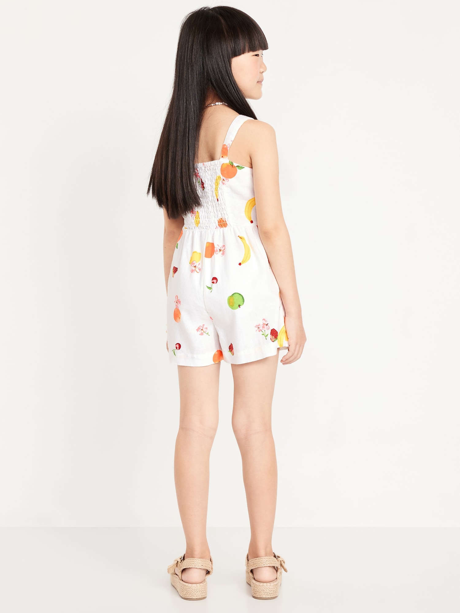 Printed Sleeveless Button-Front Linen-Blend Romper for Girls: heart neckline, wide shoulder straps, button-front, seamed waist, smocked back, on-seam pockets, all-over pattern, #691100