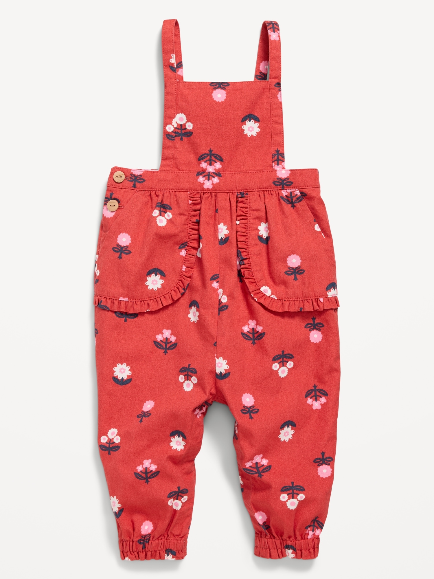 Printed Sleeveless Jumpsuit for Baby: square neckline, thin shoulder straps, diagonal on-seam pockets, hidden snaps along inseam, cinched leg cuffs, embroidered pattern, #802255