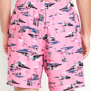 Printed Swim Trunks — 7-inch inseam: elastic-drawstring waistband, on-seam pockets, back patch pocket with grommet drain, built-in mesh briefs, pull-on style, #766290