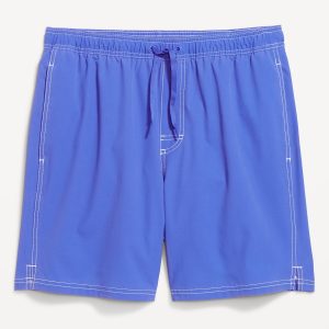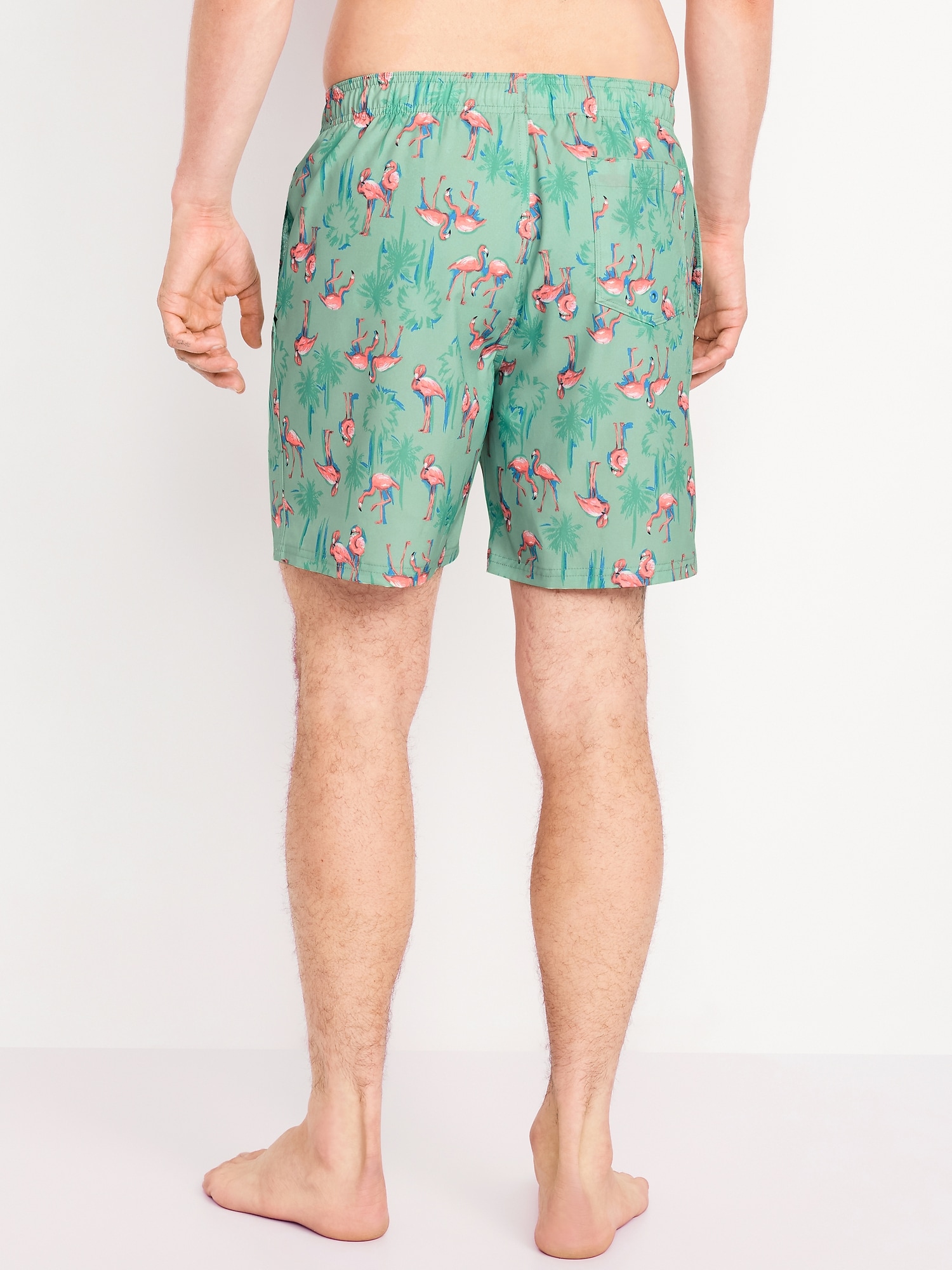 Printed Swim Trunks — 7-inch inseam: elastic-drawstring waistband, on-seam pockets, back patch pocket with grommet drain, built-in mesh briefs, pull-on style, #766290