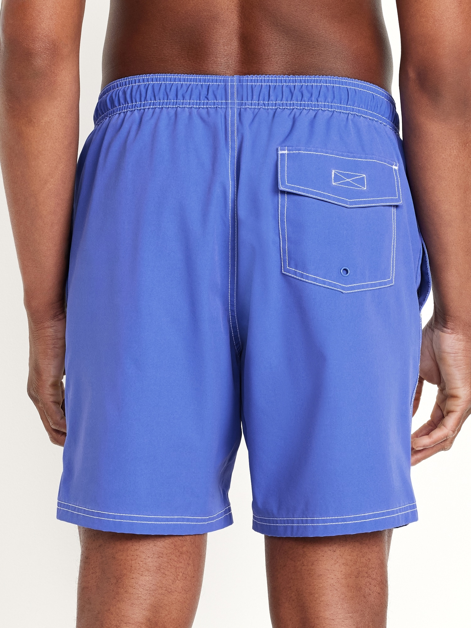 Printed Swim Trunks — 7-inch inseam: elastic-drawstring waistband, on-seam pockets, back patch pocket with grommet drain, built-in mesh briefs, pull-on style, #766290