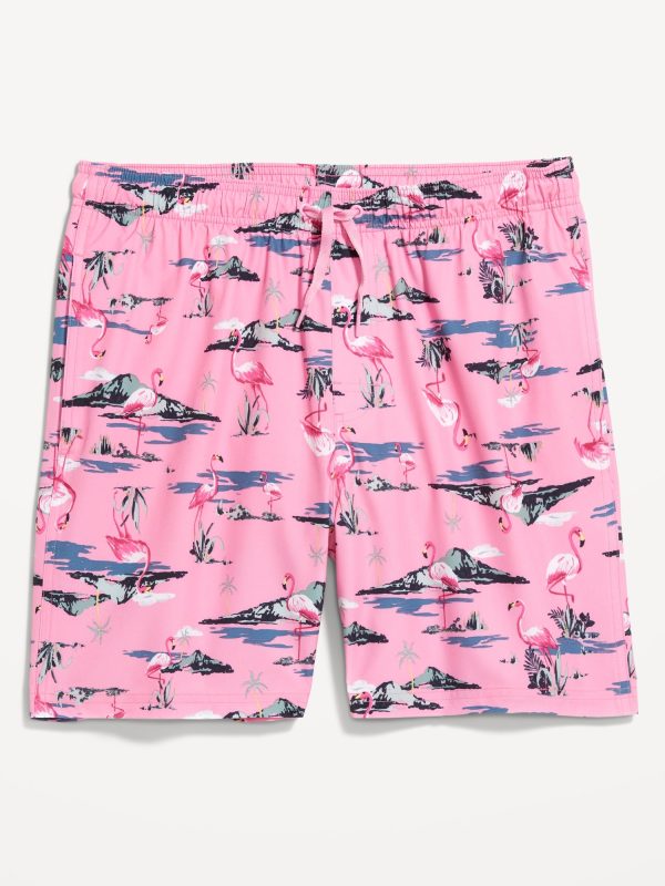 Printed Swim Trunks — 7-inch inseam: elastic-drawstring waistband, on-seam pockets, back patch pocket with grommet drain, built-in mesh briefs, pull-on style, #766290