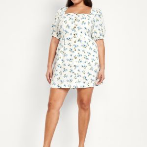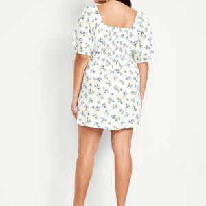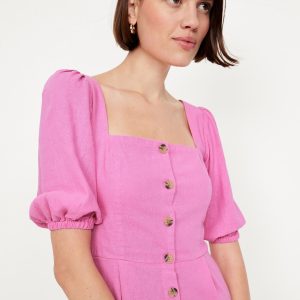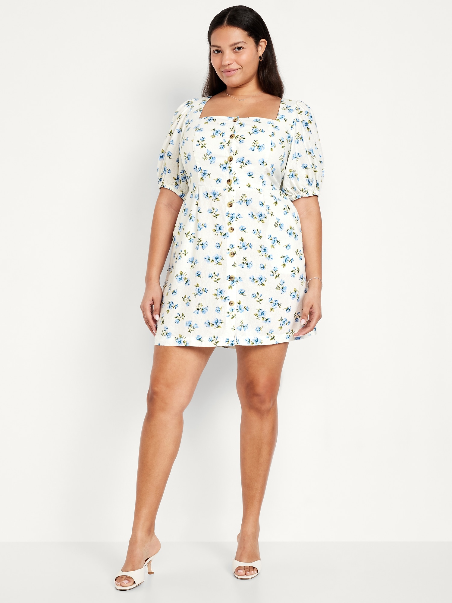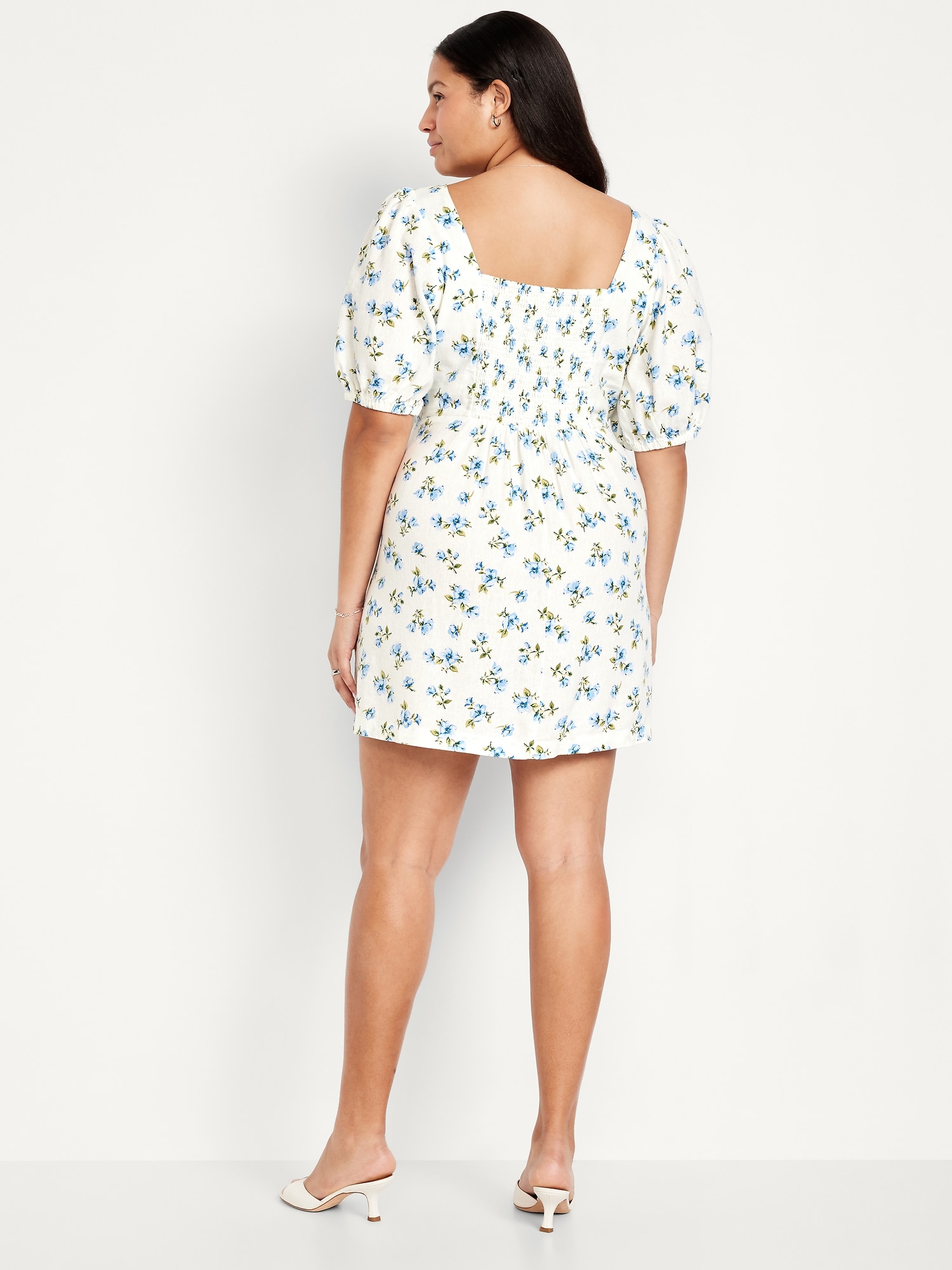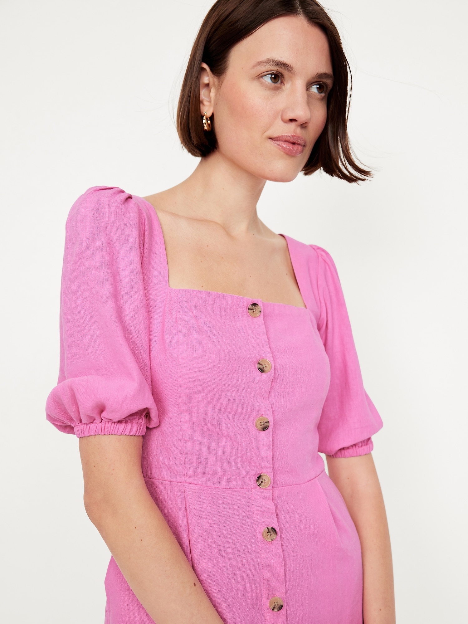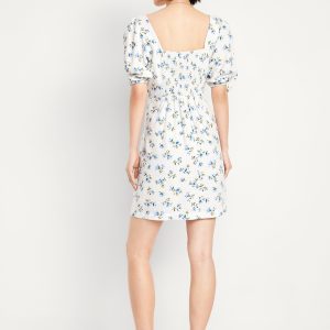 Puff-Sleeve Linen-Blend Mini Dress: square neck, short puff sleeves, elastic cuffs, full-button front, smocked back, diagonal hip pockets, seamed waist, #705712