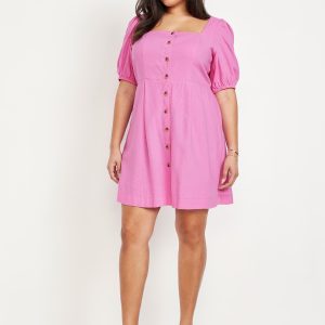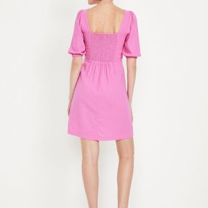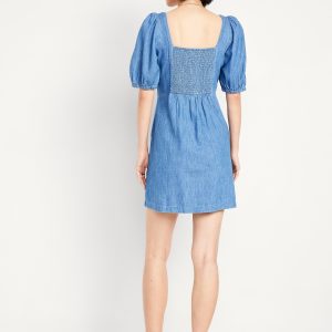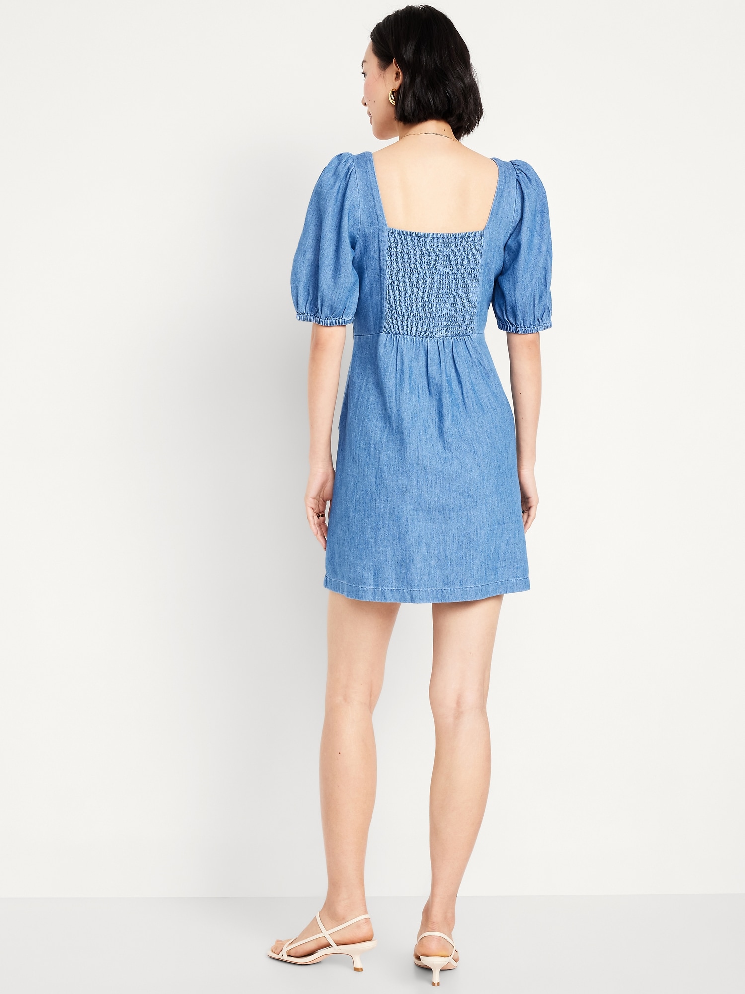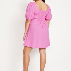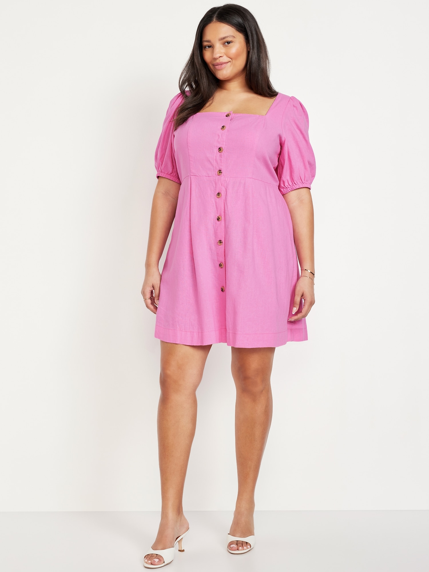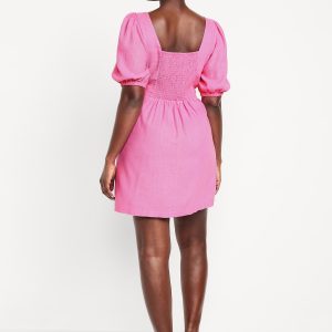 Puff-Sleeve Linen-Blend Mini Dress: square neck, short puff sleeves, elastic cuffs, full-button front, smocked back, diagonal hip pockets, seamed waist, #705712