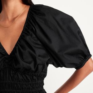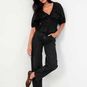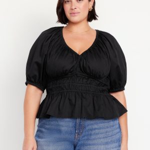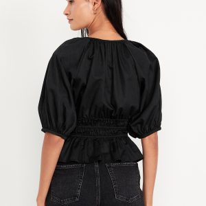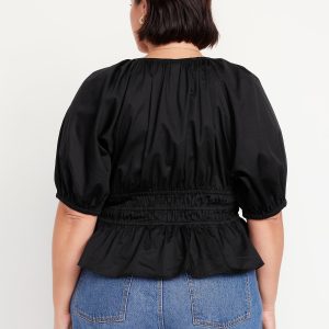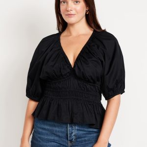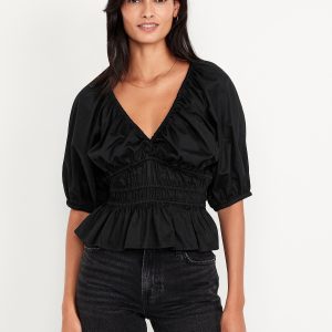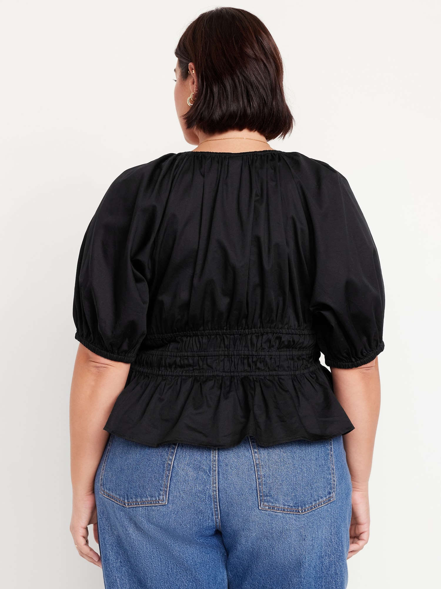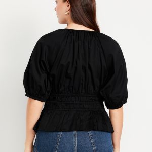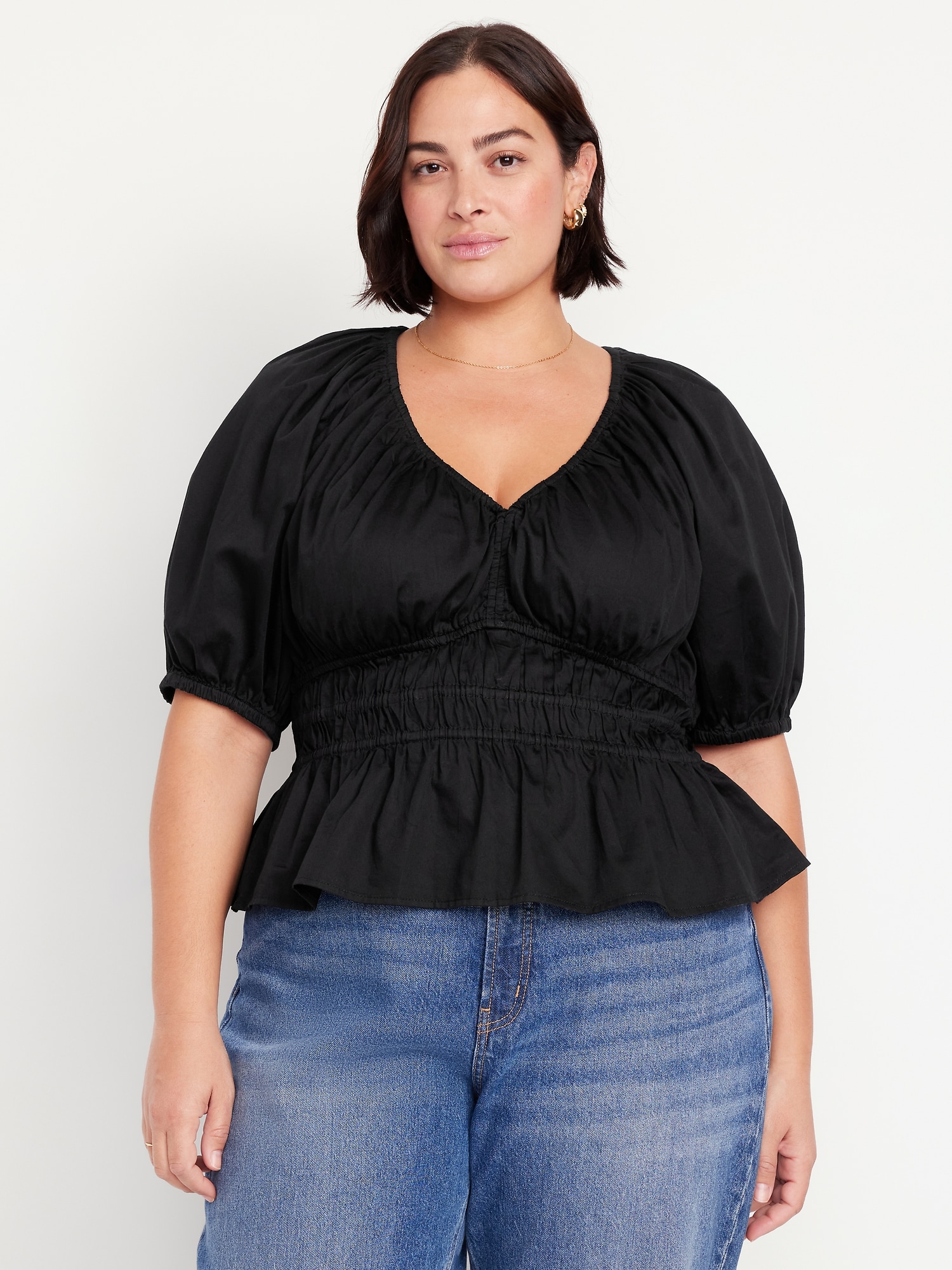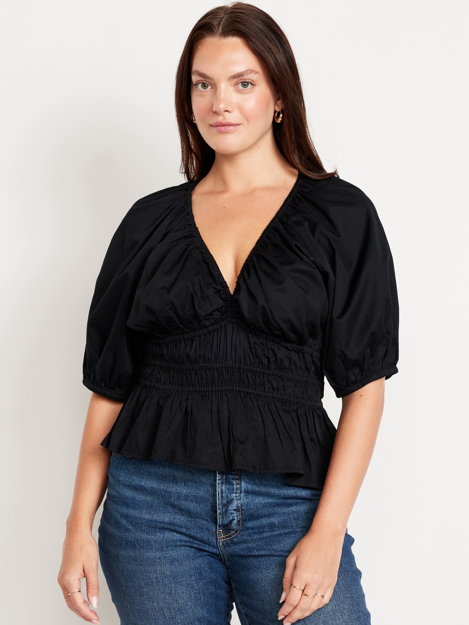 Puff-Sleeve Top: deep v-neck, elbow sleeves, elastic cuffs, smocked waist, peplum hem, gingham print, #704199