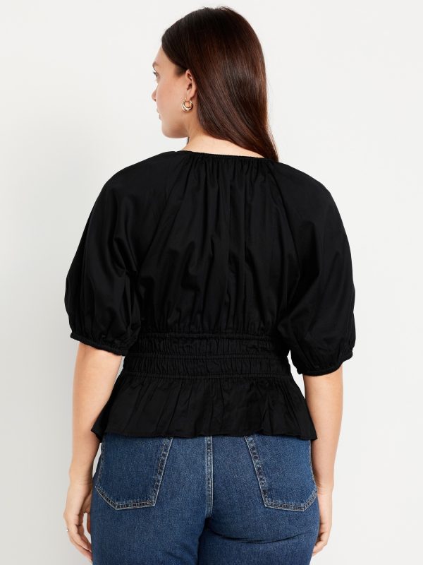 Puff-Sleeve Top: deep v-neck, elbow sleeves, elastic cuffs, smocked waist, peplum hem, gingham print, #704199
