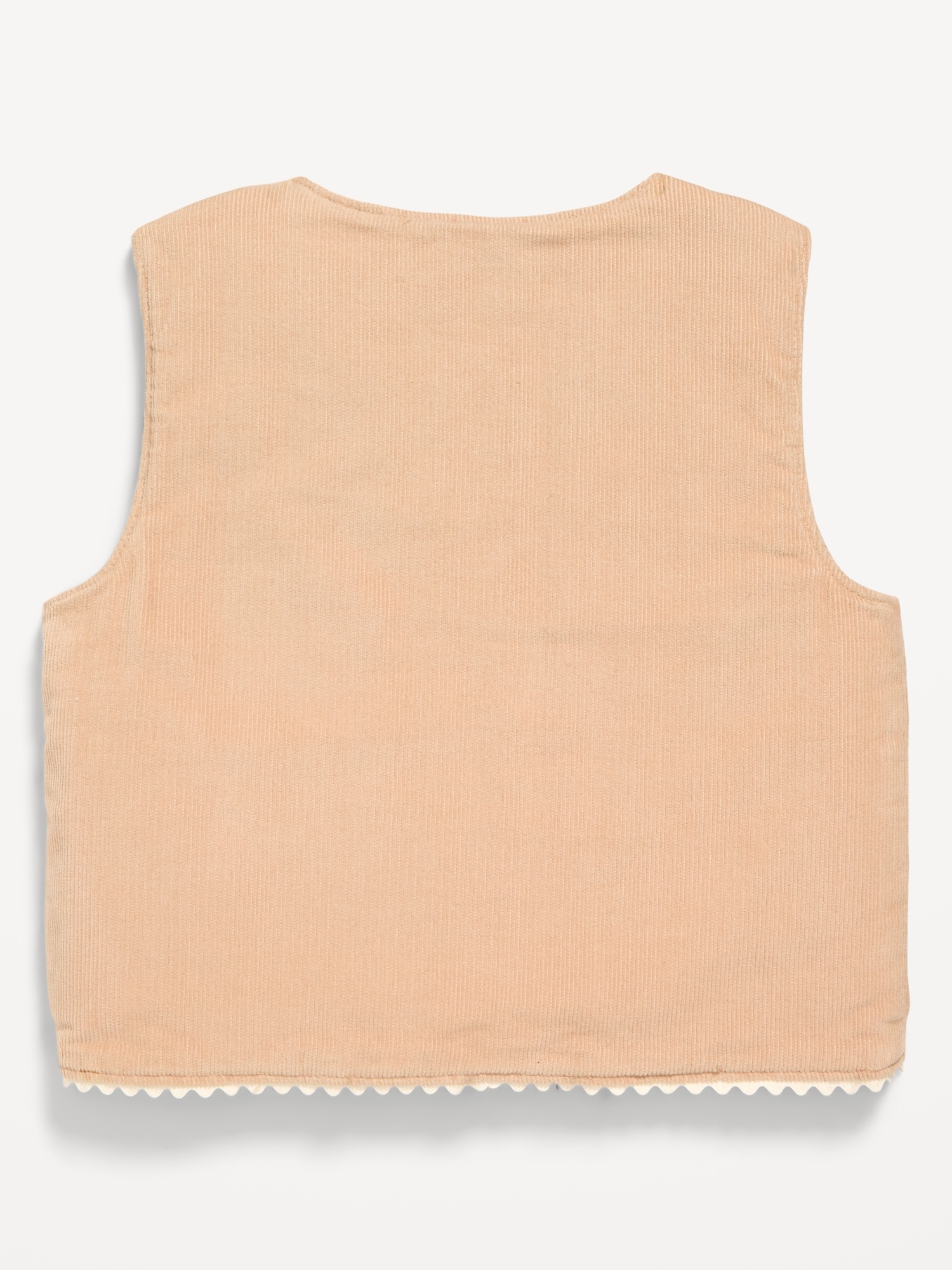 Reversible Corduroy Vest for Toddler Girls: round neckline, sleeveless, all-over print interior lining, patch pockets at hem with embroidered patch, scallop trim, reversible, #801404