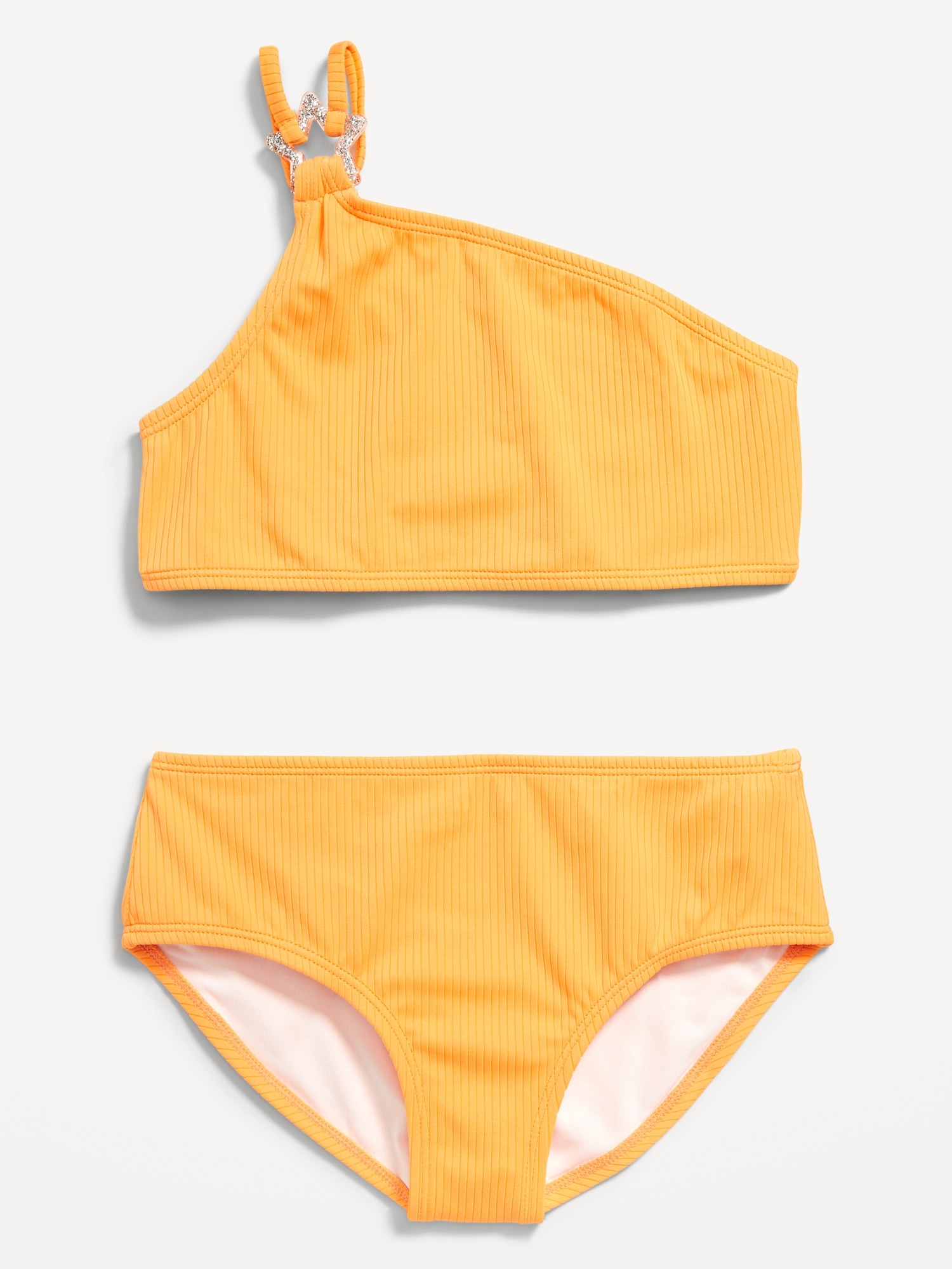 Ribbed Asymmetric Swim Set for Girls: asymmetric neckline, decorative ring along straps, bikini swim bottoms, elasticized waistband, #692037