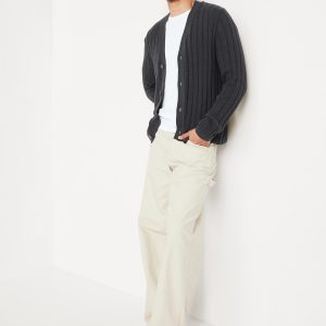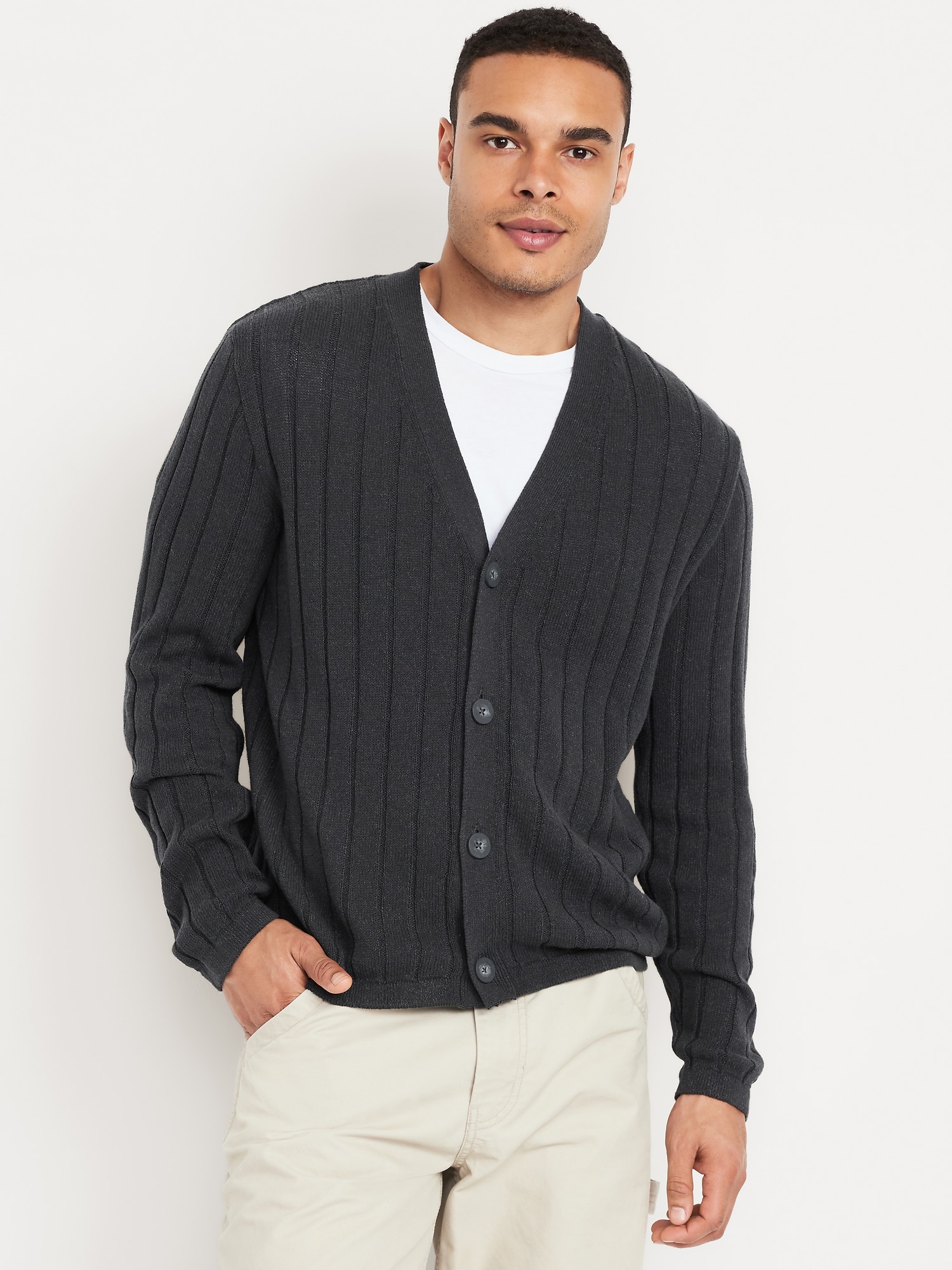 Ribbed Button-Front Cardigan: v-neck, long sleeves, four-button front, #791324
