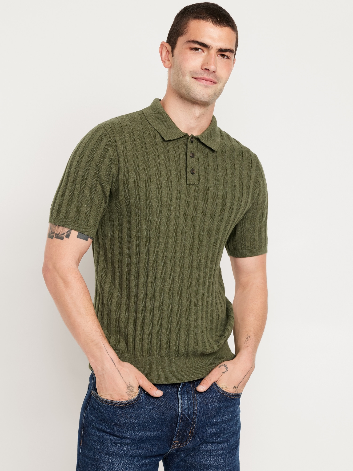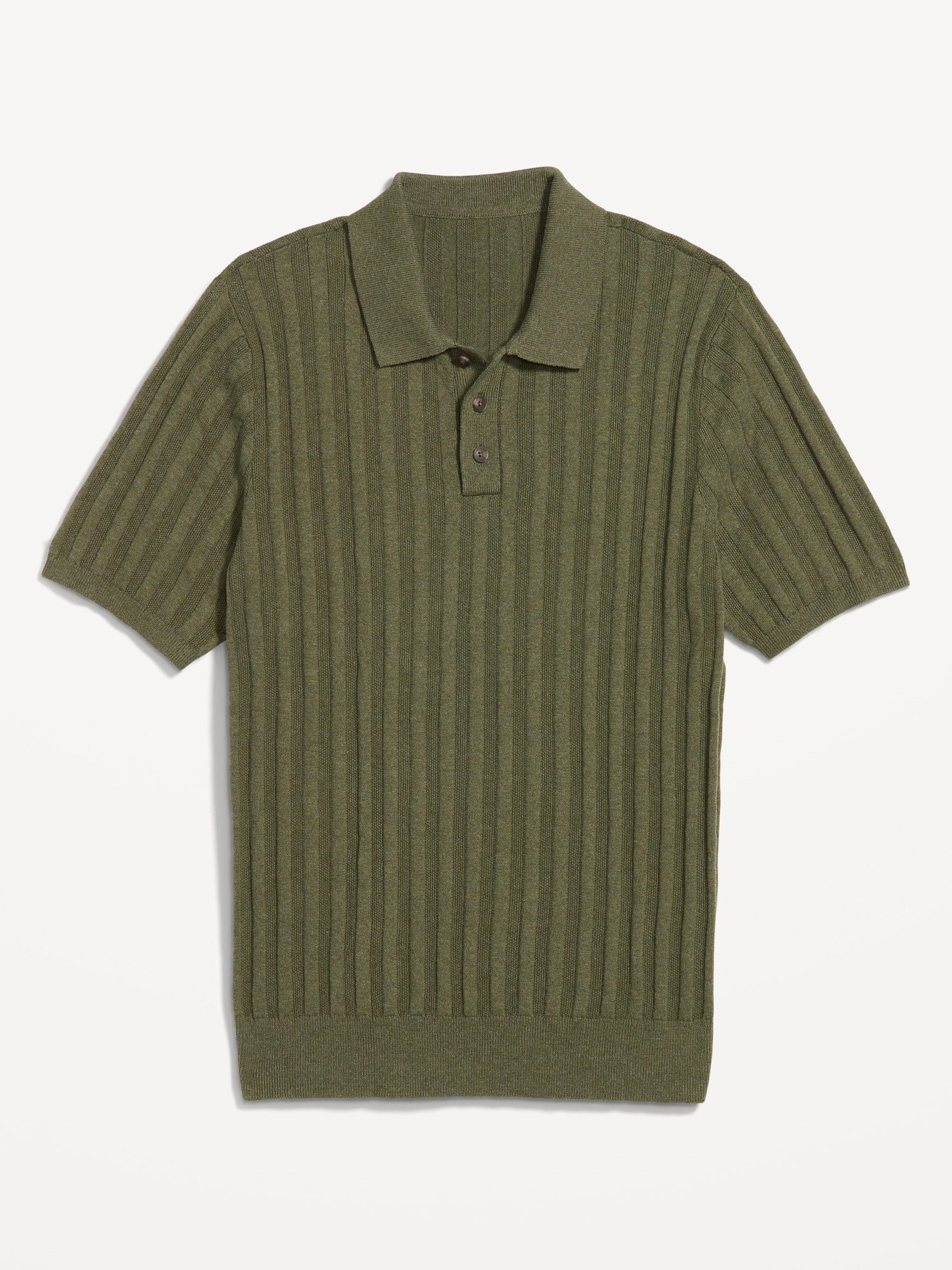 Ribbed Polo Sweater: spread collar, short sleeves, buttoned placket, pullover style, #802042