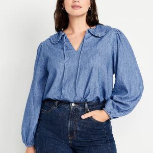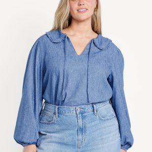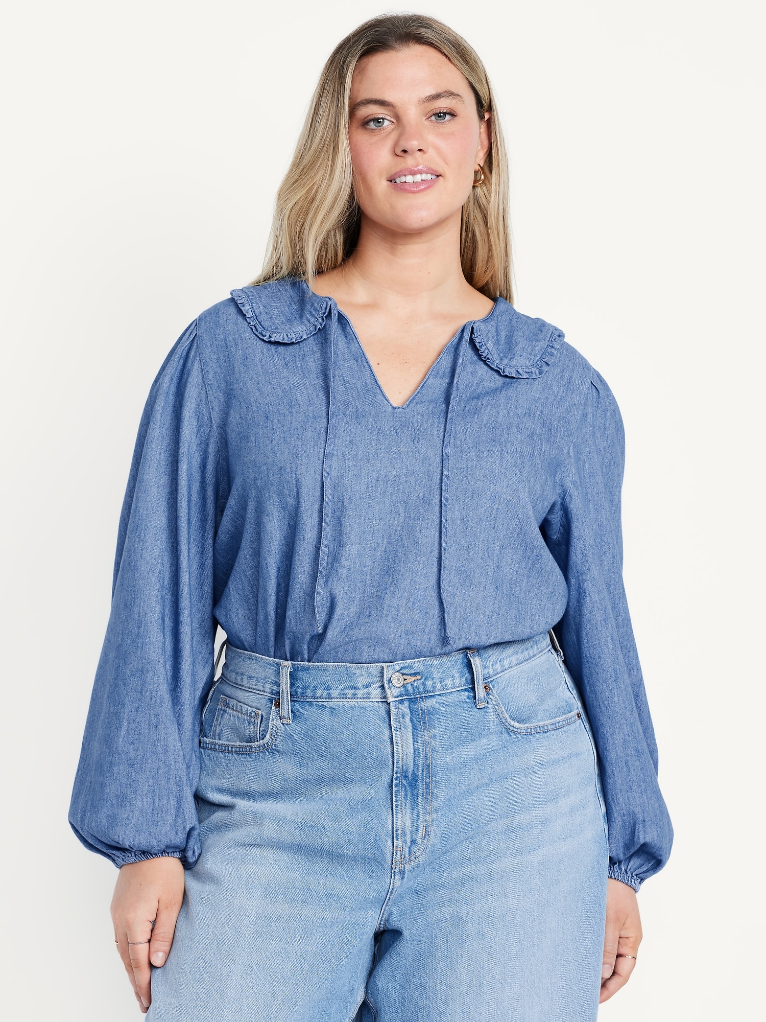 Ruffle-Collar Top: ruffled tie-neck collar, long blouson sleeves with elastic cuffs, cutwork hem, shirred detail, #805736