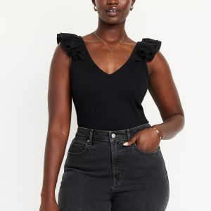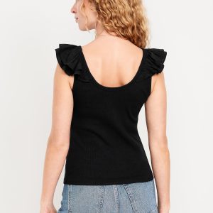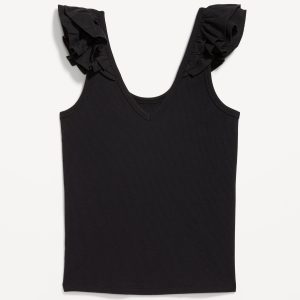 Ruffle-Trim Mixed Material Top: v-neck, ruffled sleeve openings, #686637