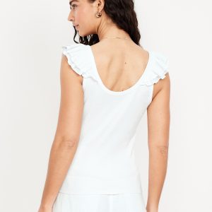 Ruffle-Trim Mixed Material Top: v-neck, ruffled sleeve openings, #686637