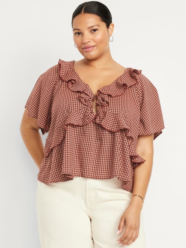Ruffle V-Neck Top: tie-front v-neck, ruffle overlay at front, short flutter sleeves, #805737