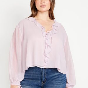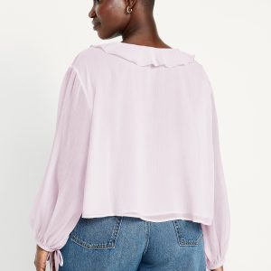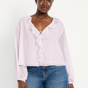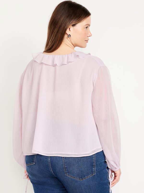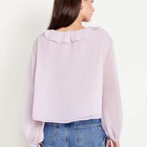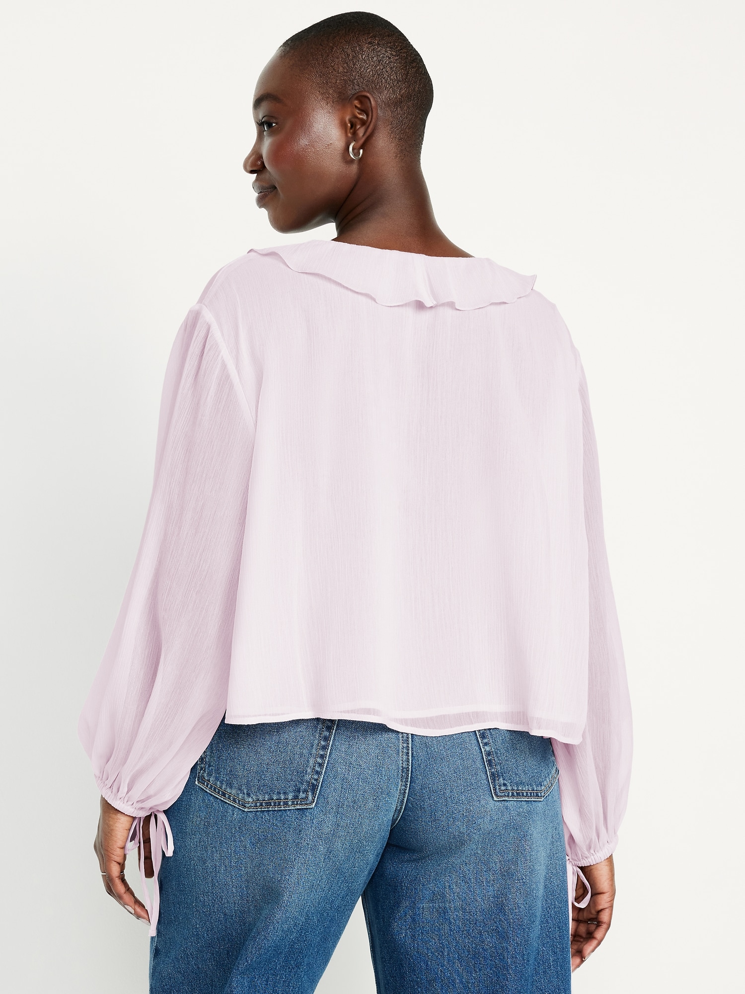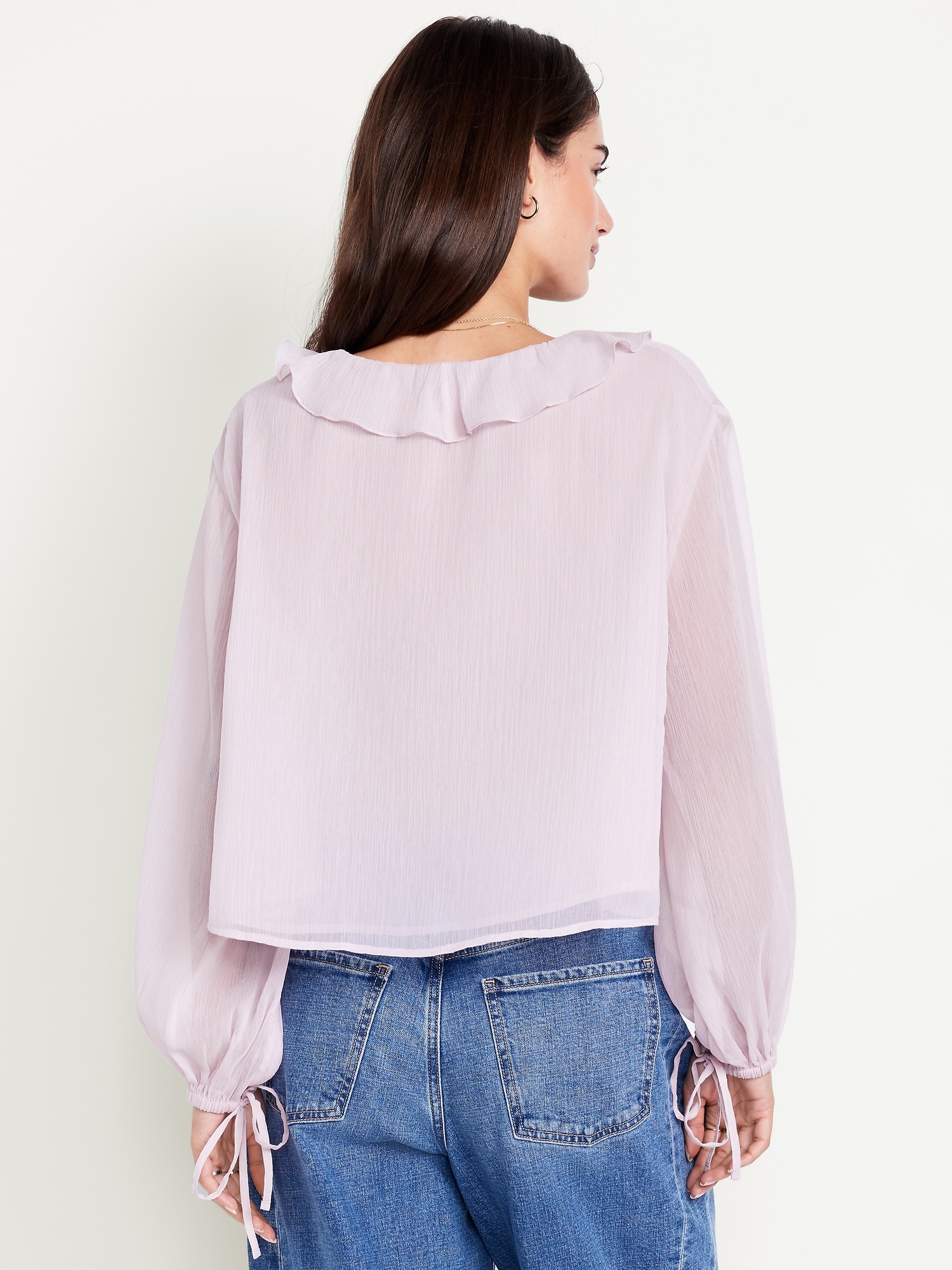 Ruffled Chiffon Cropped Blouse: ruffled v-neck, long drop-shoulder sleeves, elastic tie cuffs, decorative tie front, #704110