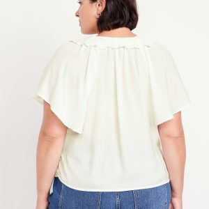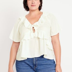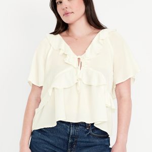 Satin Ruffle Tie-Front Top: tie-front v-neck, ruffle overlay at front, short flutter sleeves, #805737