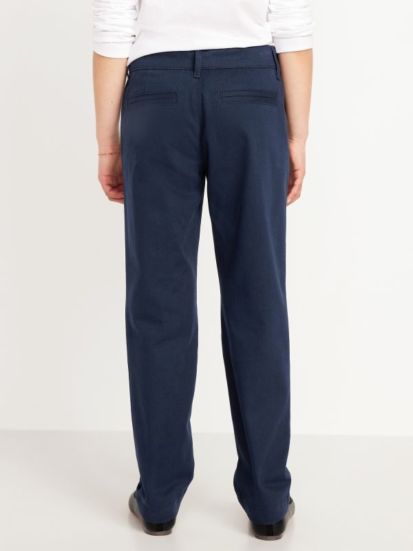 School Uniform Straight Leg Pants for Girls: interior adjustable waistband, sizes 5-8 snap-decorative button closure, sizes 10-20 regular button closure, zip fly, slant pockets in front, decorative welt pockets in back, #767121
