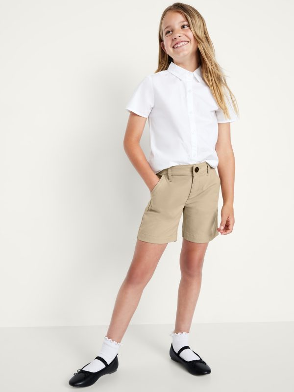 School Uniform Twill Bermuda Shorts for Girls: interior adjustable waistband, snap-button closure in sizes 5-8, regular button closure in sizes 10-20, zip fly, diagonal on-seam hip pockets, welt faux pockets at back, #767123