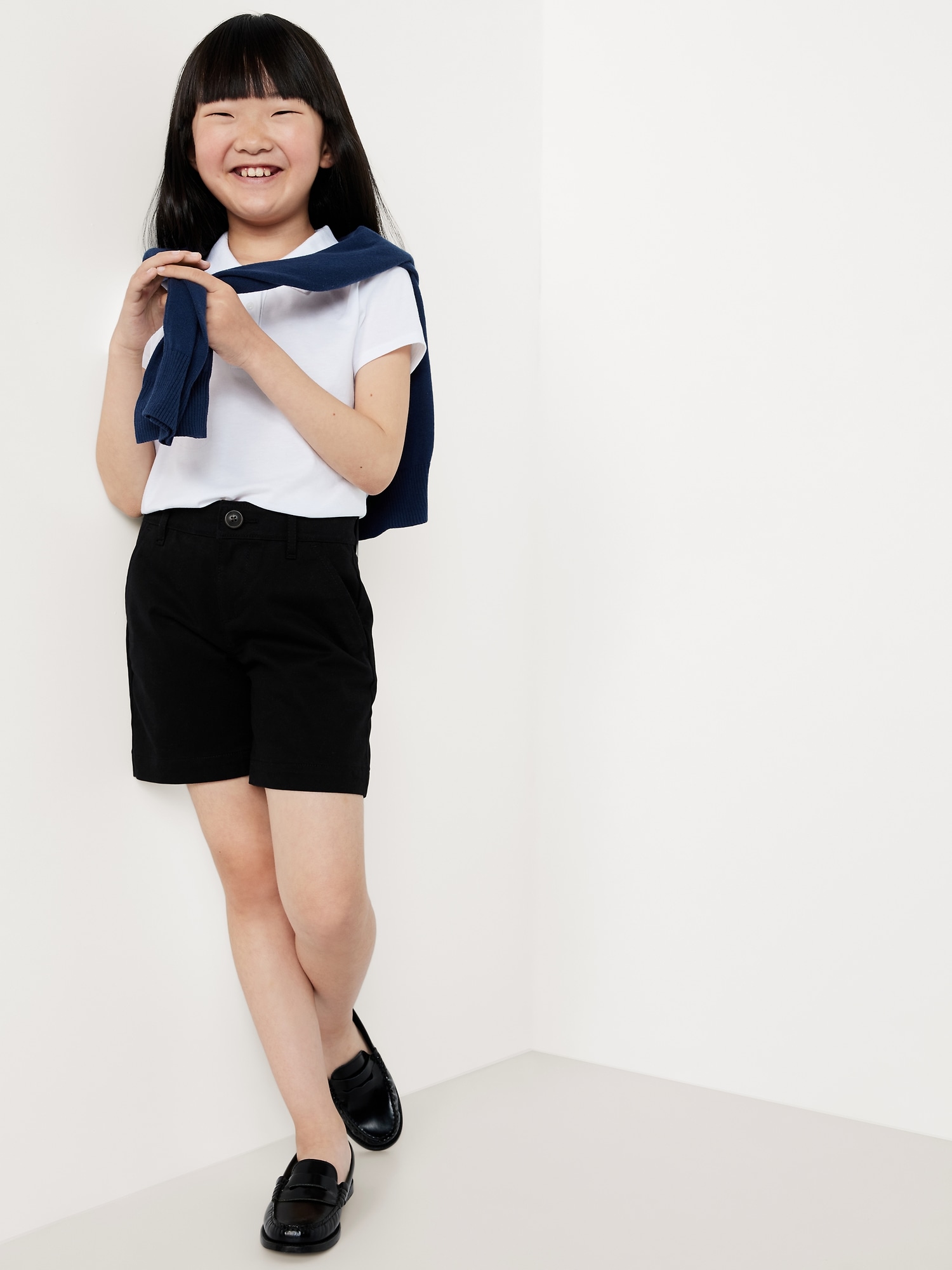 School Uniform Twill Bermuda Shorts for Girls: interior adjustable waistband, snap-button closure in sizes 5-8, regular button closure in sizes 10-20, zip fly, diagonal on-seam hip pockets, welt faux pockets at back, #767123
