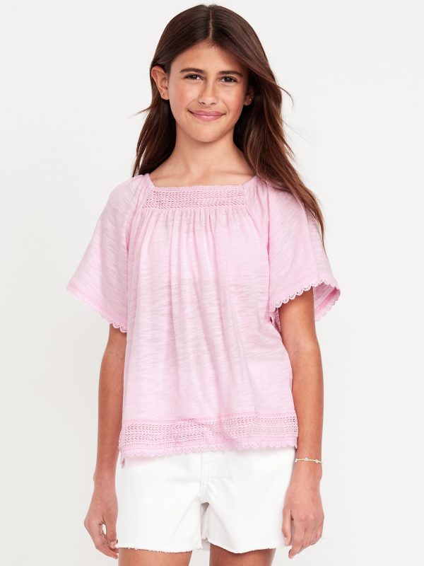 Short Flutter-Sleeve Crochet-Trim Top for Girls: square neckline, short flutter sleeves, crochet-knit trim, online exclusive, #767940