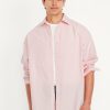 Short-Sleeve Cropped Heavyweight Camp Shirt: notched collar, short sleeves, full-button front, vertical striped print, #762762