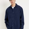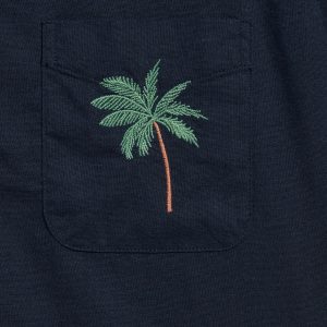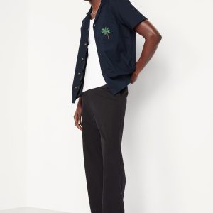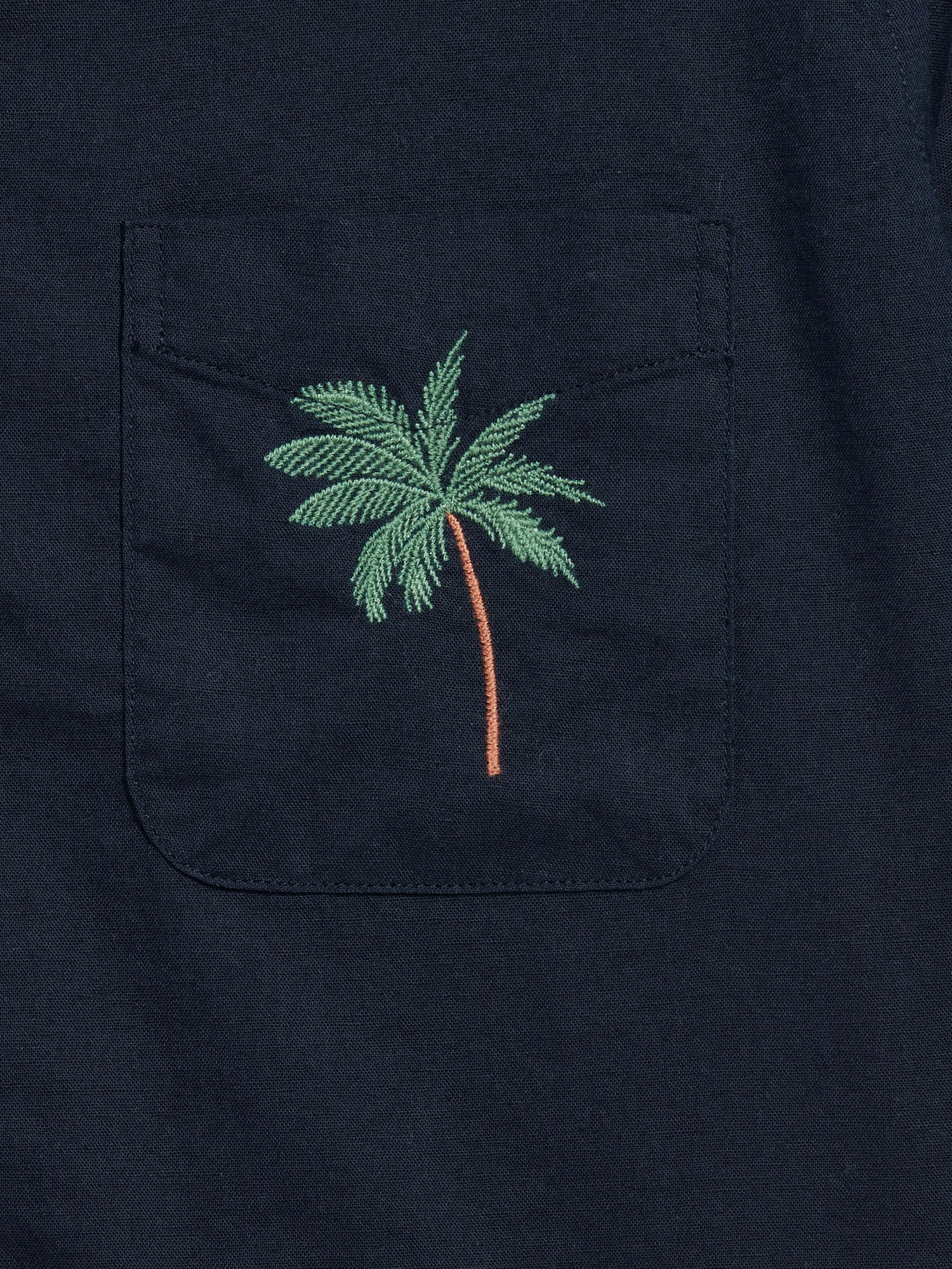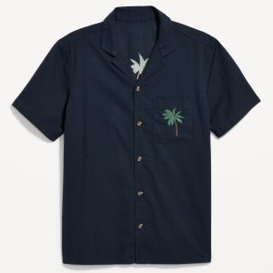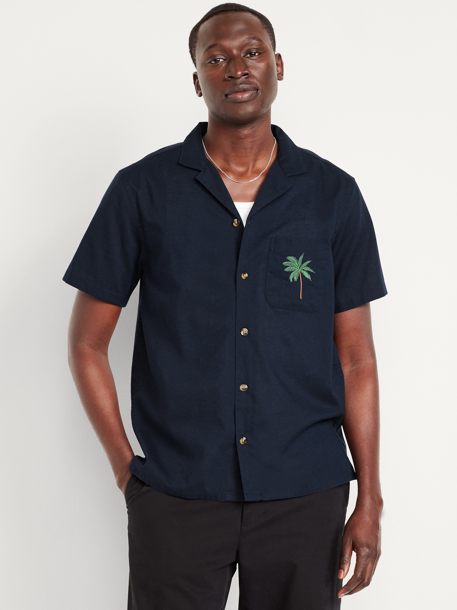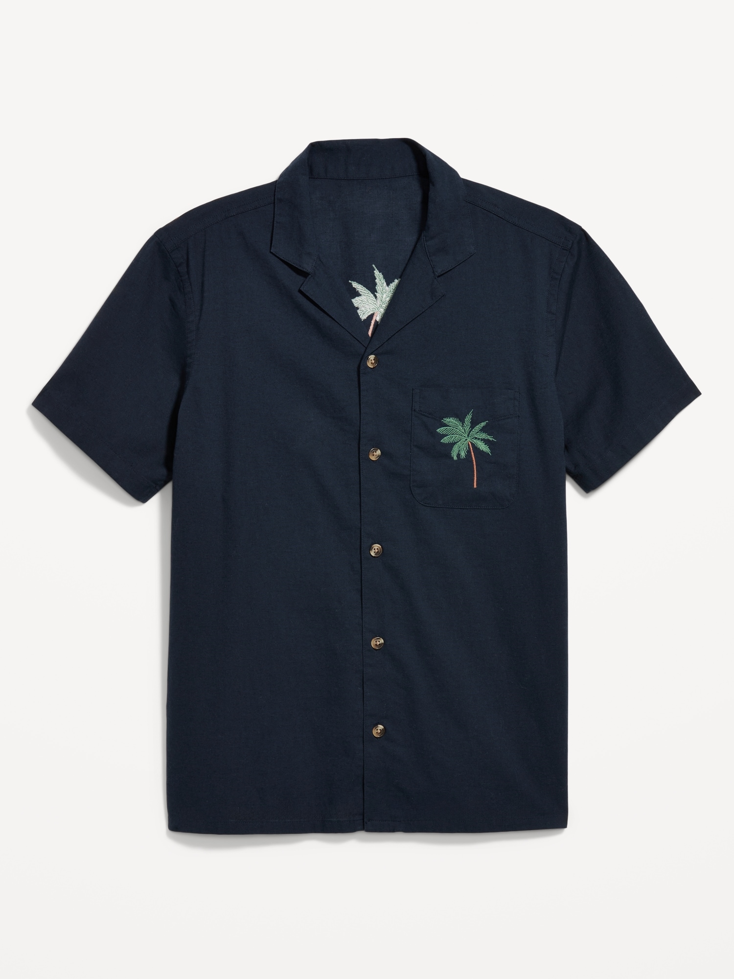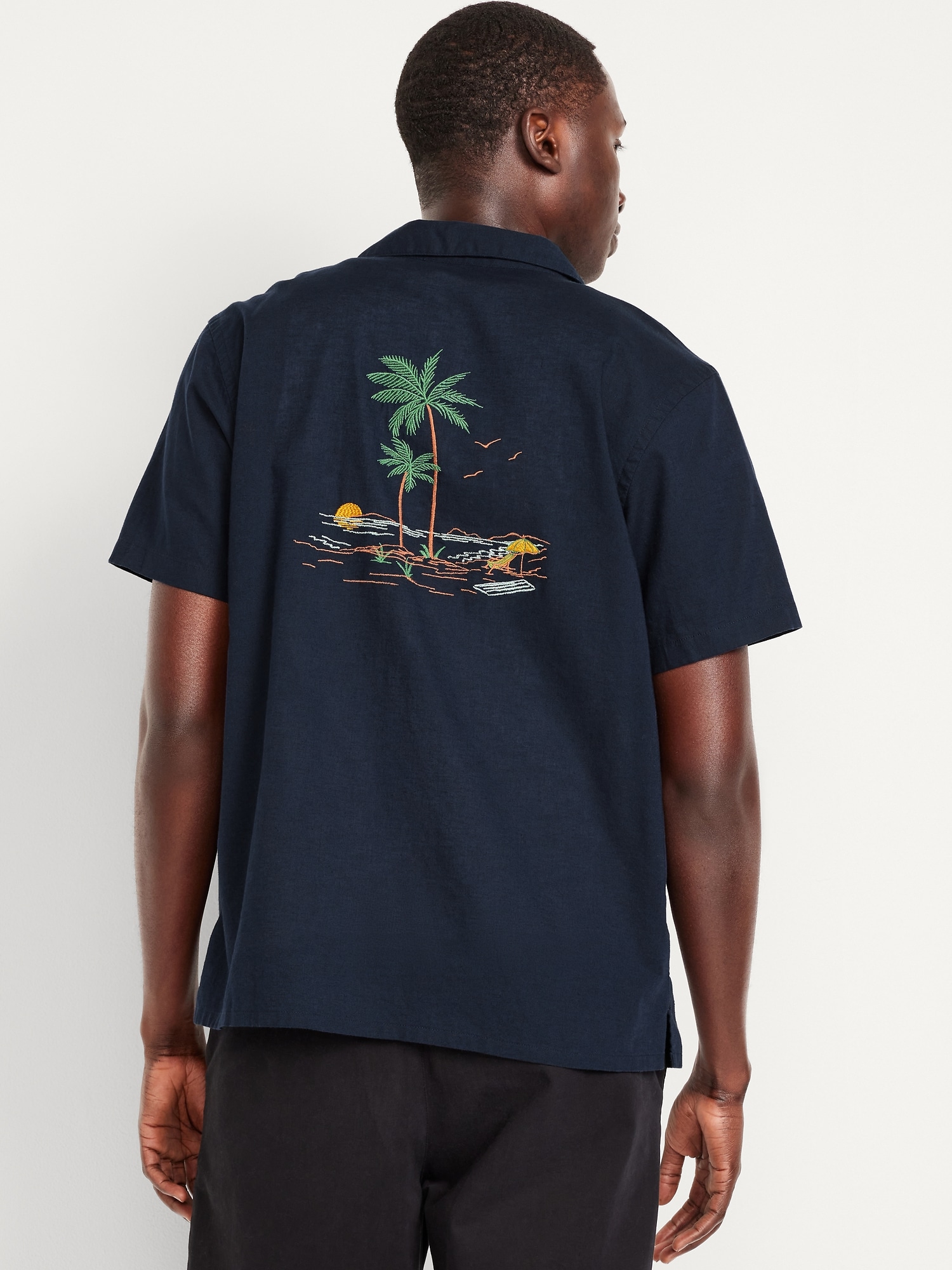 Short-Sleeve Embroidered Camp Shirt: notched collar, short sleeves, full-button front, vertical striped print, #762762