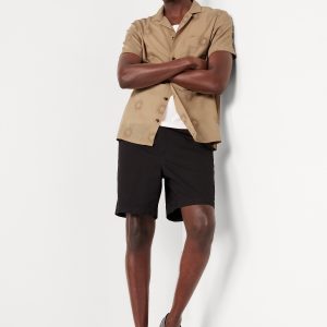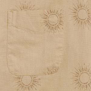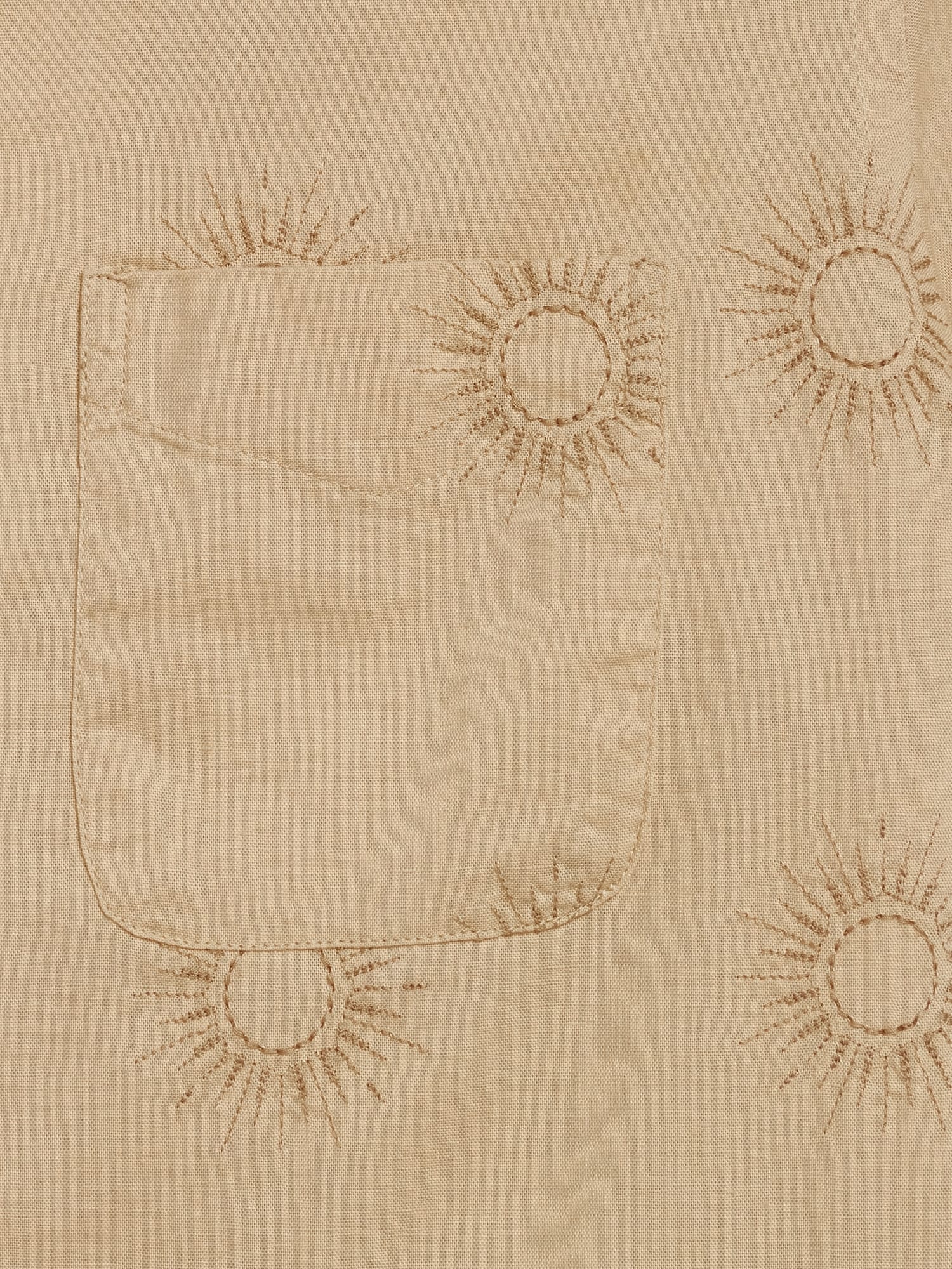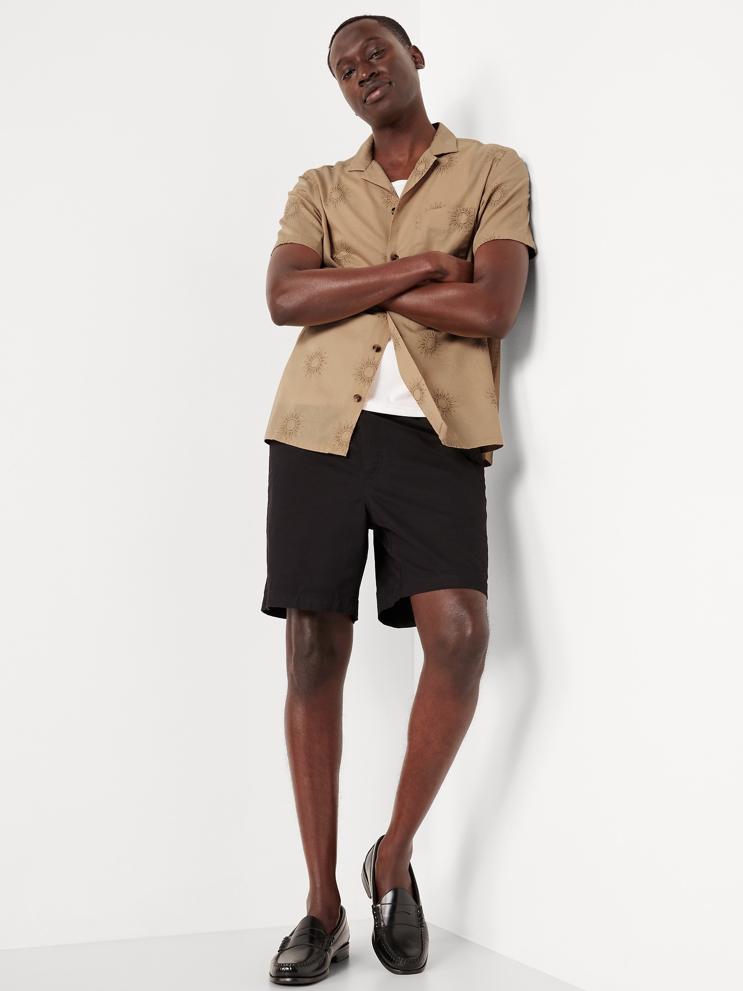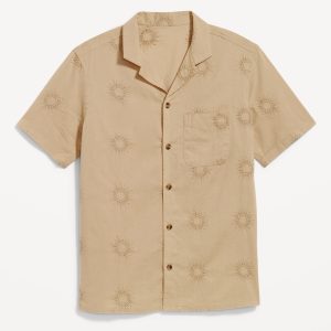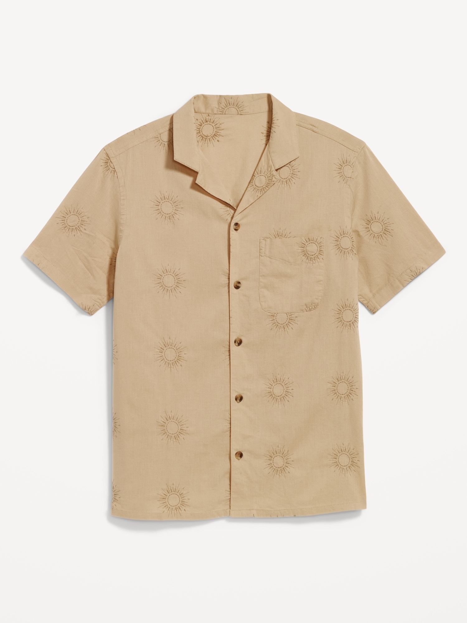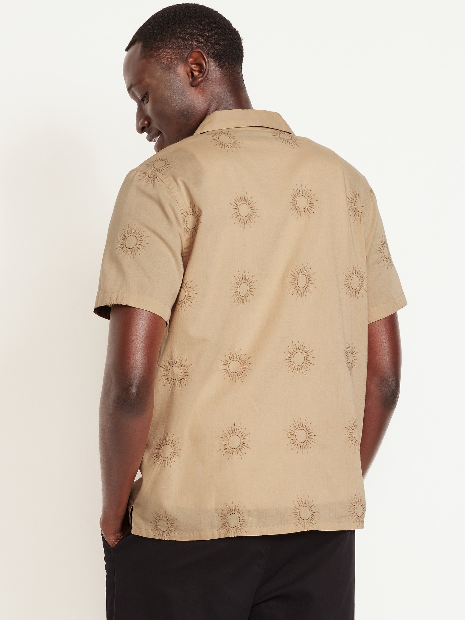 Short-Sleeve Embroidered Camp Shirt: notched collar, short sleeves, full-button front, vertical striped print, #762762