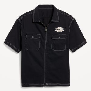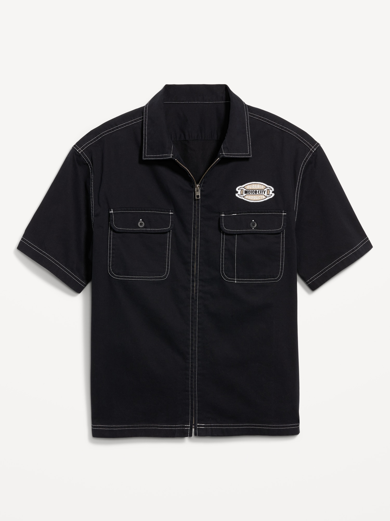 Short-Sleeve Moto Zip Shirt: spread collar, short sleeves, full-zip front, button-flap chest pockets, embroidered chest patch varies, #804489