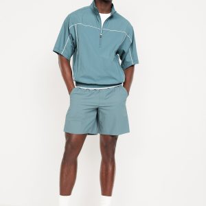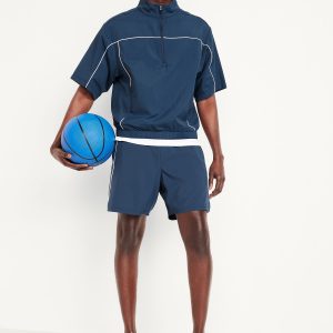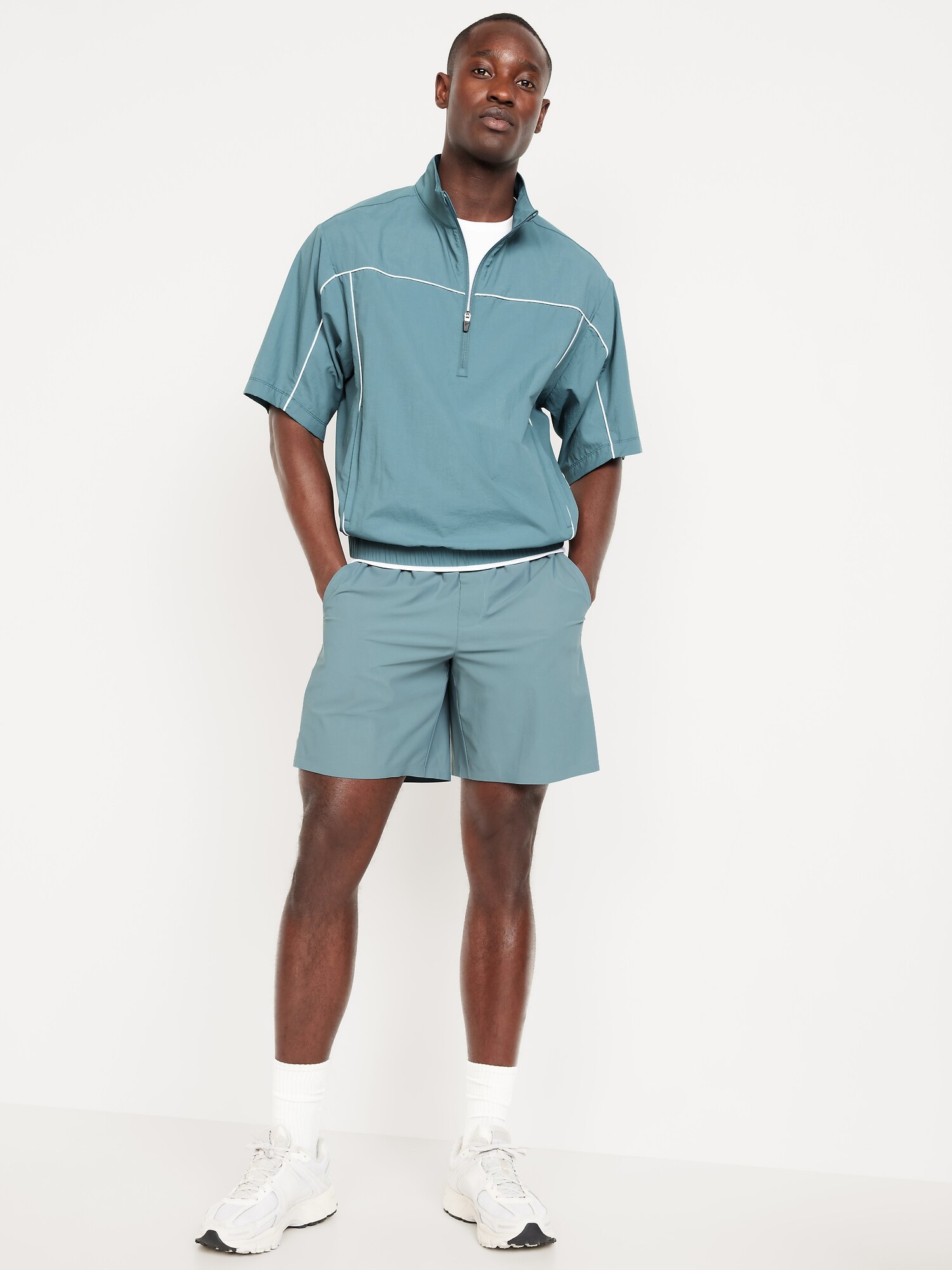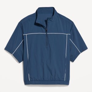 Short-Sleeve Nylon Half-Zip Top: mock neck, short sleeves, half-zip front, vertical zip pockets, cinched-elastic hem, contrasting piping at chest, sleeve and side panels, #749727
